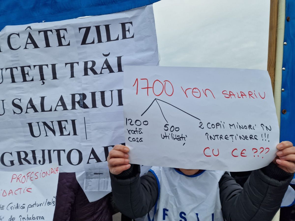 Protestatarii au avut în mână pancarte cu diferite mesaje precum: CÂTE zile puteți trăi cu salariul unei îngrijitoare?