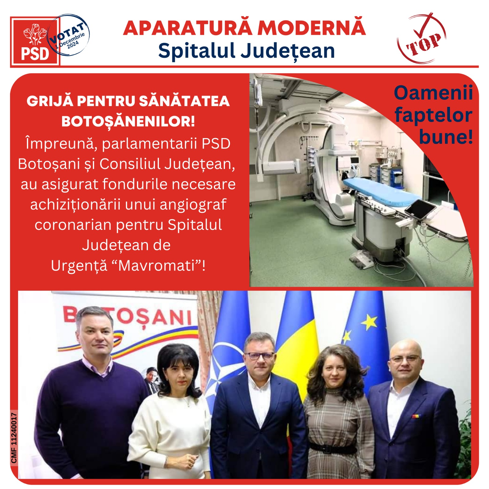 Cei patru parlamentari PSD de Botoșani – Marius Budăi, Dan Şlincu, Alexandra Huțu și Lucian Trufin au depus și susținut la dezbaterea Legii Bugetului pe 2024 un amendament prin care s-au alocat 2 milioane de lei, iar, la începutul anului, Doina Federovici a alocat Spitalului din bugetul județean alte 6,2 milioane de lei pentru achiziționarea unui angiograf coronarian de ultimă generație.