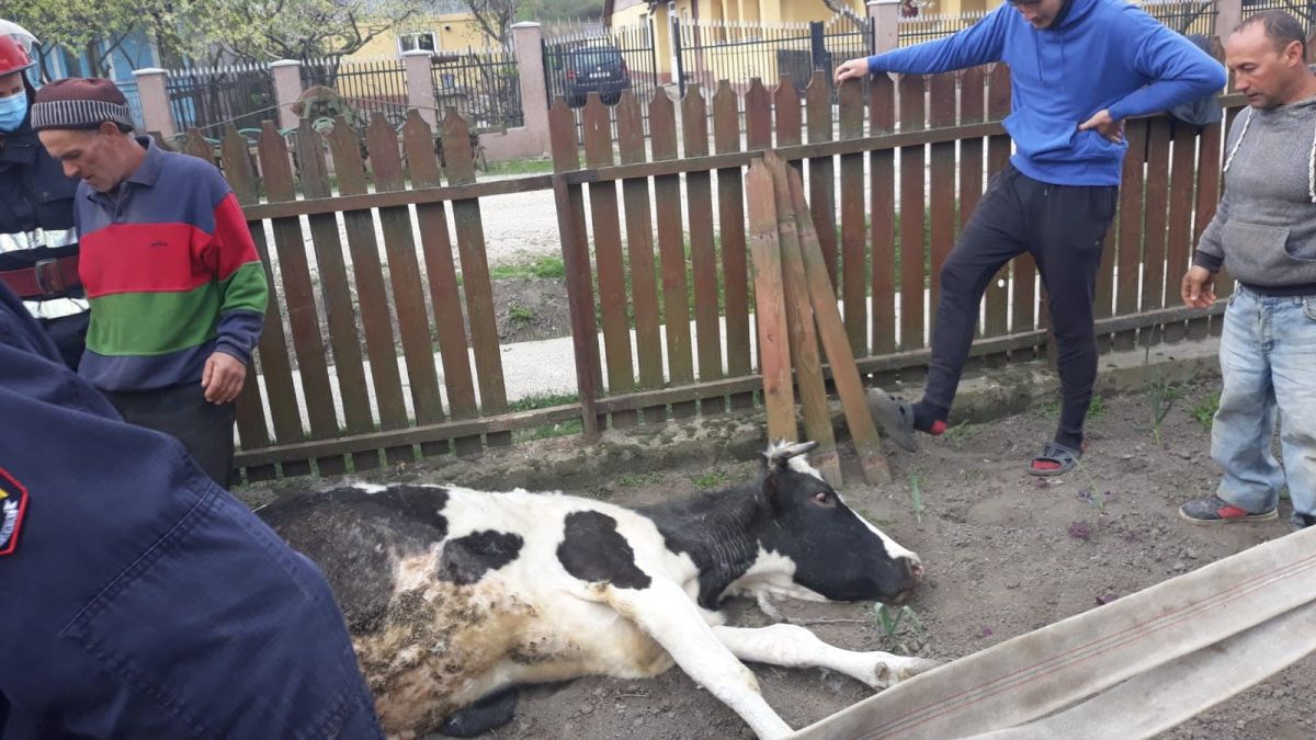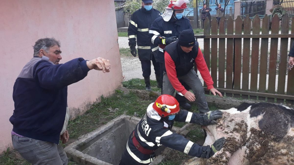 Intervenţie dificilă a pompierilor din Ștefănești solicitaţi să salveze o bovină căzută într-un cămin de apă adânc de aproximativ un metru şi jumătate, din gospodăria unui localnic din comuna Românești.