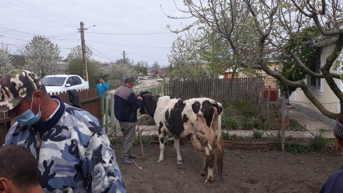 Pompierii au legat bovina, care cântărește peste 450 de kg, cu mai multe furtunuri şi au reuşit să o scoată din captivitate.