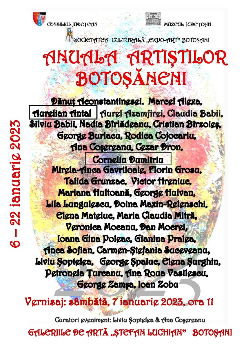 Muzeul Judeţean Botoșani – Secția de Artă Plastică și Etnografie vă invită sâmbătă, 7 ianuarie 2023, ora 11.00, la Galeriile de Artă „Ștefan Luchianˮ Botoșani, la vernisajul lucrărilor expuse la „Anuala artiștilor botoșăneni”.