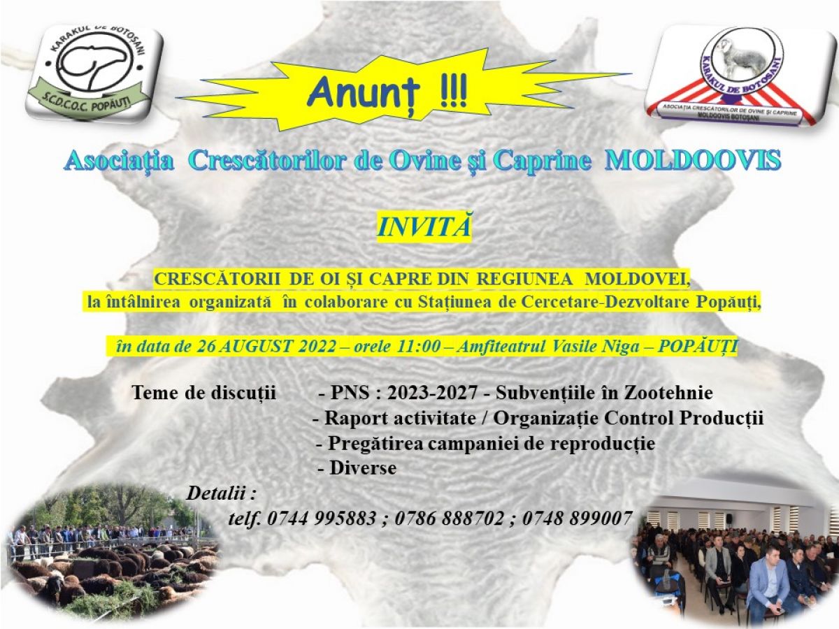 Asociația Crescătorilor de Ovine și Caprine (ACOC) Moldoovis invită crescătorii de oi și capre din regiunea Moldovei la întâlnirea organizată în colaborare cu Stațiunea de Cercetare – Dezvoltare Popăuți în data de 26 august 2022, orele 11:00, în amfiteatrul Vasile Niga – Popăuți.