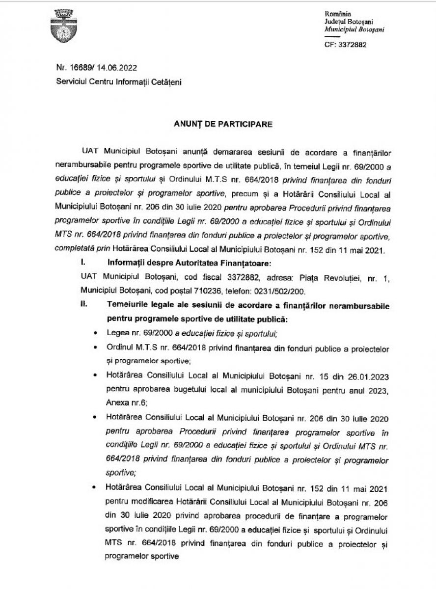 UAT Municipiul Botoșani anunță demararea sesiunii de acordare a finanțărilor nerambursabile pentru programele sportive de utilitate publică, în temeiul legii nr.69/2000 a educației fizice și sportului și Ordinului MTS nr. 664/2018 privind finanțarea din fonduri publice a proiectelor și programelor sportive,