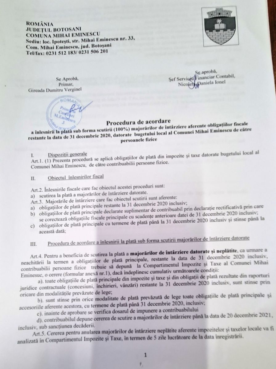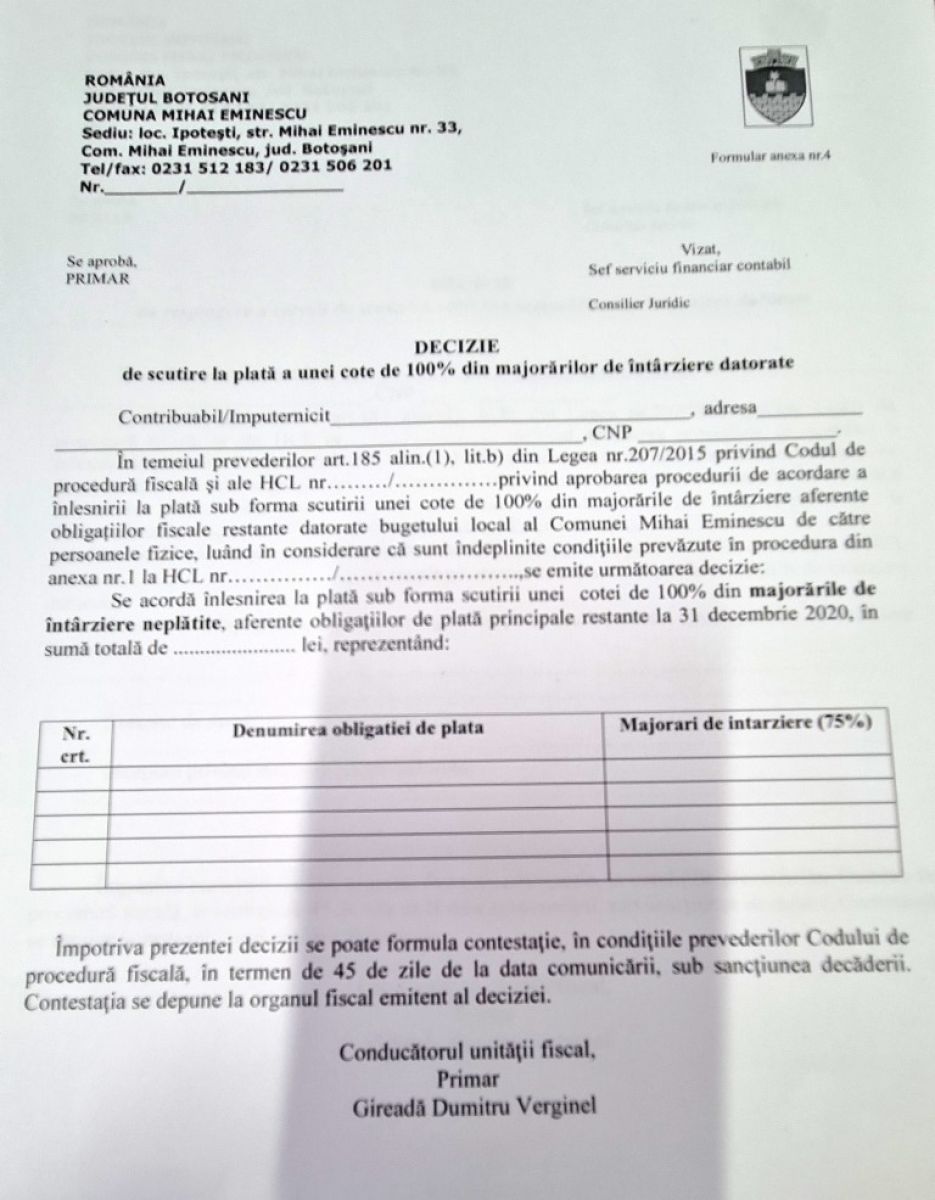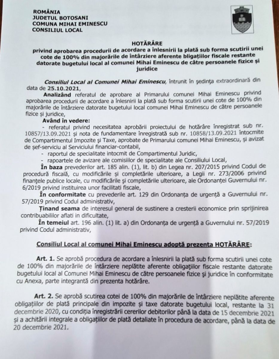 Având în vedere nivelul ridicat al majorărilor de întârziere datorate bugetului local de către contribuabili, atât persoane fizice cât și persoane juridice, Consiliul Local al comunei Mihai Eminescu a aprobat prin Hotărârea Consiliului Local nr. 135/25.10.2021 – privind aprobarea procedurii de acordare a înlesnirii la plata sub forma scutirii unei cote de 100% din majorările de întârziere aferente obligațiilor fiscale restante datorate bugetului local al comunei Mihai Eminescu de către persoanele fizice și juridice -