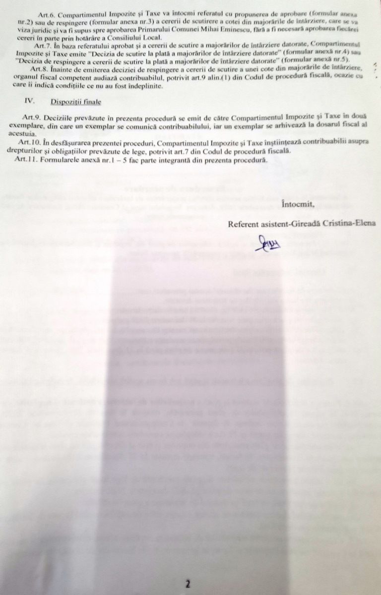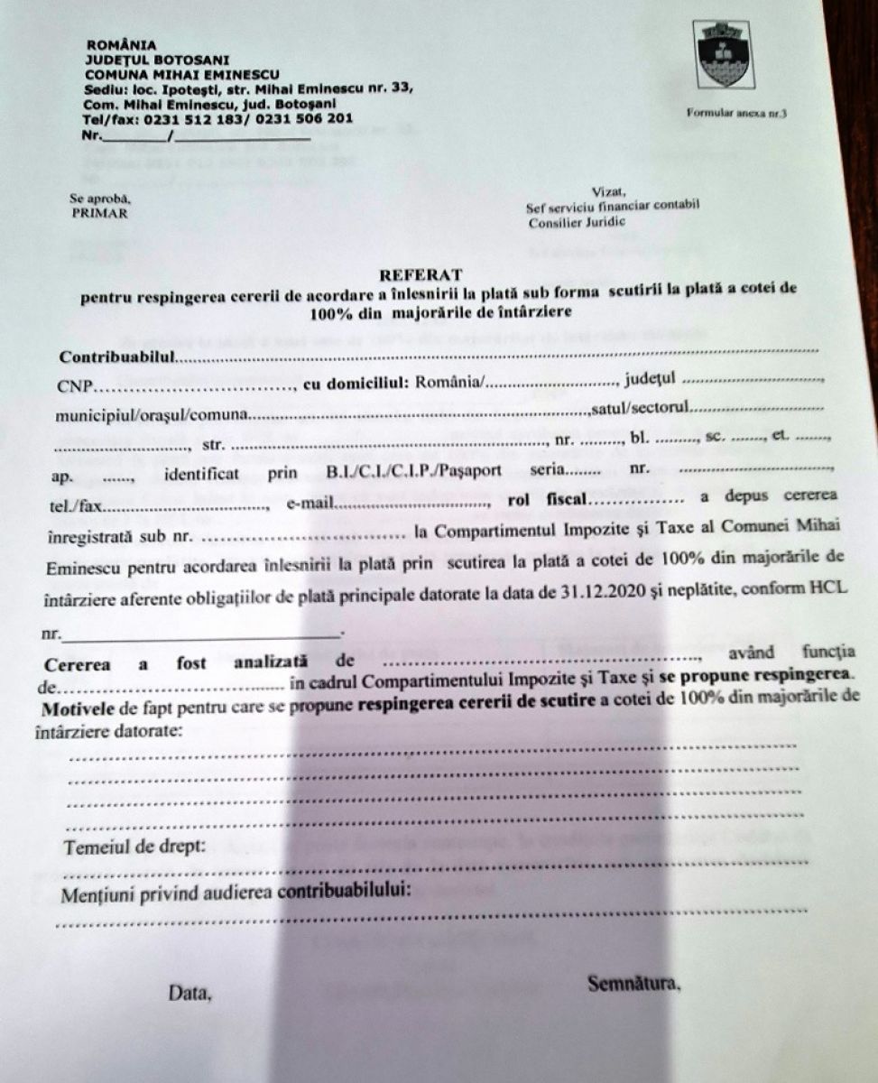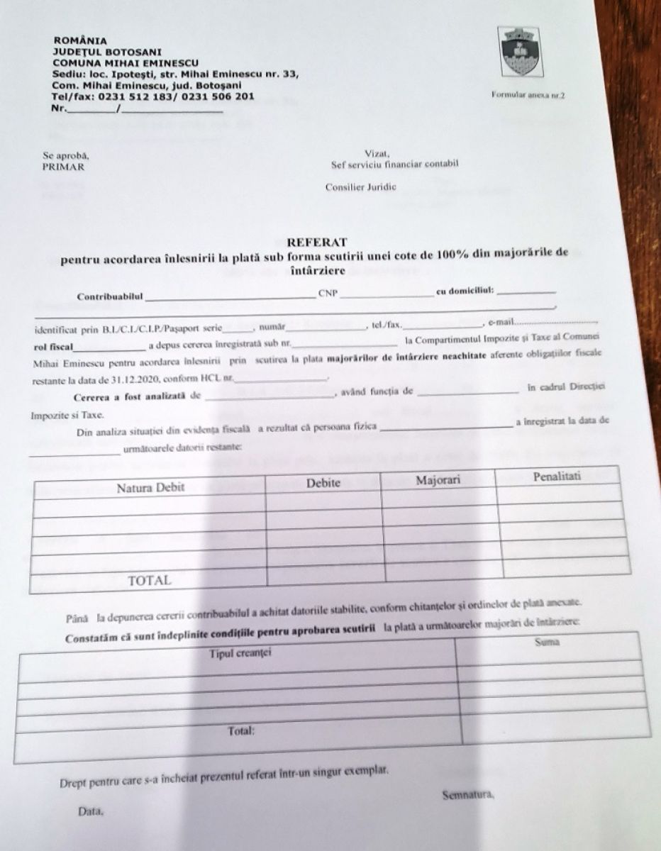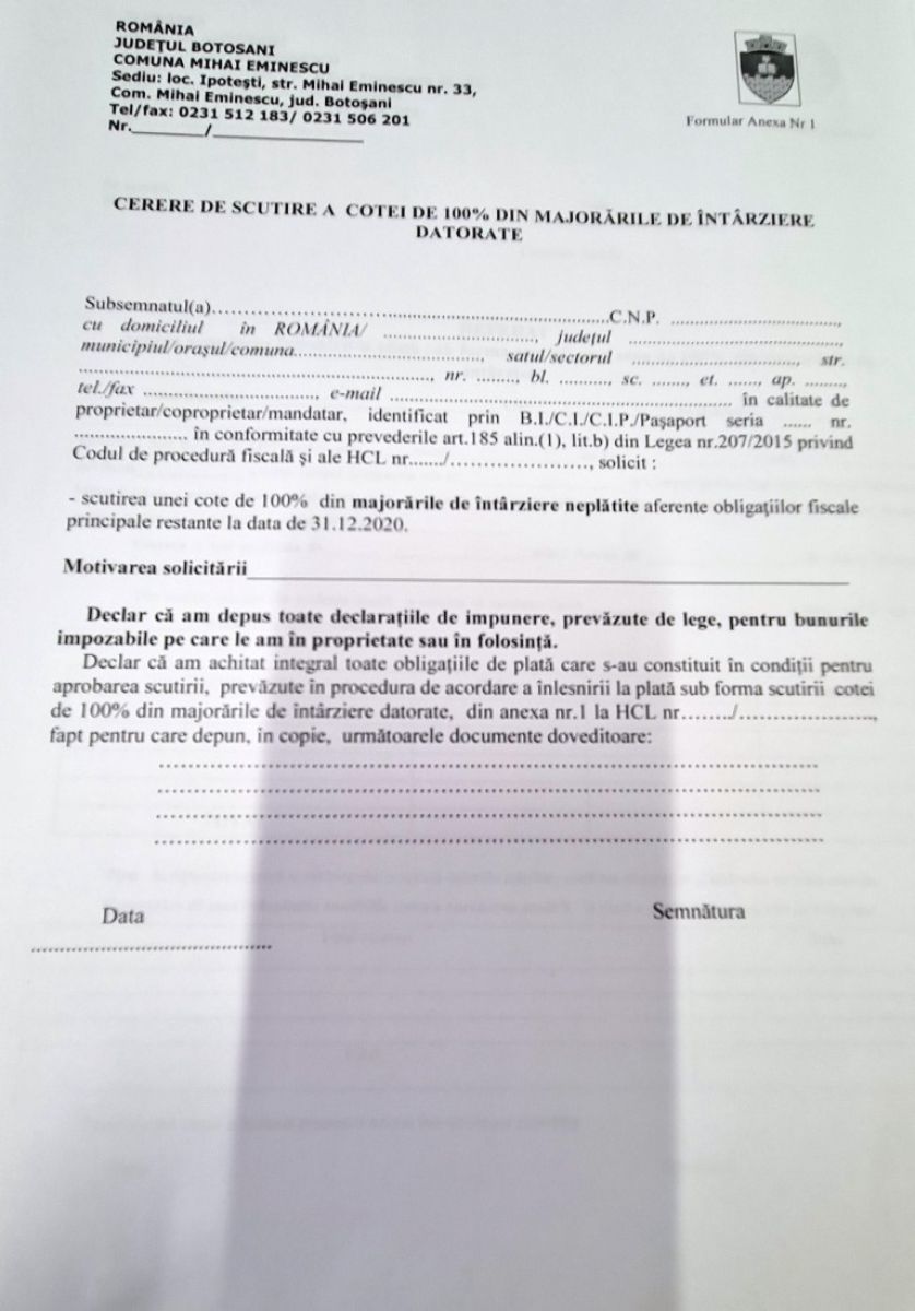 Având în vedere nivelul ridicat al majorărilor de întârziere datorate bugetului local de către contribuabili, atât persoane fizice cât și persoane juridice, Consiliul Local al comunei Mihai Eminescu a aprobat prin Hotărârea Consiliului Local nr. 135/25.10.2021 – privind aprobarea procedurii de acordare a înlesnirii la plata sub forma scutirii unei cote de 100% din majorările de întârziere aferente obligațiilor fiscale restante datorate bugetului local al comunei Mihai Eminescu de către persoanele fizice și juridice -