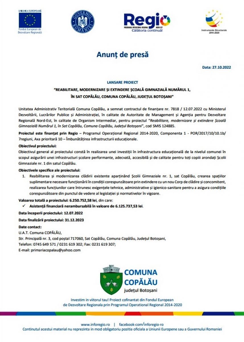 Unitatea Administrativ Teritorială Comuna Copălău, a semnat contractul de finanțare nr. 7818 / 12.07.2022 cu Ministerul Dezvoltării, Lucrărilor Publice și Administrației, în calitate de Autoritate de Management și Agenția pentru Dezvoltare Regională Nord-Est, în calitate de Organism Intermediar, pentru proiectul “Reabilitare, modernizare și extindere Școală Gimnazială Numărul 1, în Sat Copălău, Comuna Copălău, Județul Botoșani”, cod SMIS 124885.