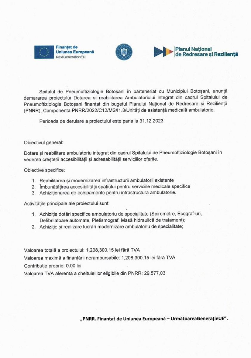 Spitalul de Pneumoftiziologie Botoșani în parteneriat cu Municipiul Botoșani, anunță demararea proiectului Dotarea si reabilitarea Ambulatoriului integrat din cadrul Spitalului de Pneumoftiziologie Botoșani finanțat din bugetul Planului Național de Redresare și Reziliență (PNRR), Componenta PNRR/2022/C12/MS/I1.3/Unități de asistență medicală ambulatorie.