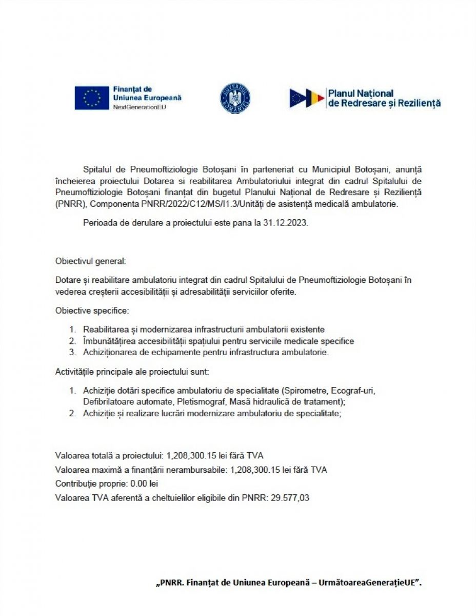 Spitalul de Pneumoftiziologie Botoșani în parteneriat cu Municipiul Botoșani, anunță încheierea proiectului Dotarea si reabilitarea Ambulatoriului integrat din cadrul Spitalului de Pneumoftiziologie Botoșani finanțat din bugetul Planului Național de Redresare și Reziliență (PNRR), Componenta PNRR/2022/C12/MS/I1.3/Unități de asistență medicală ambulatorie.