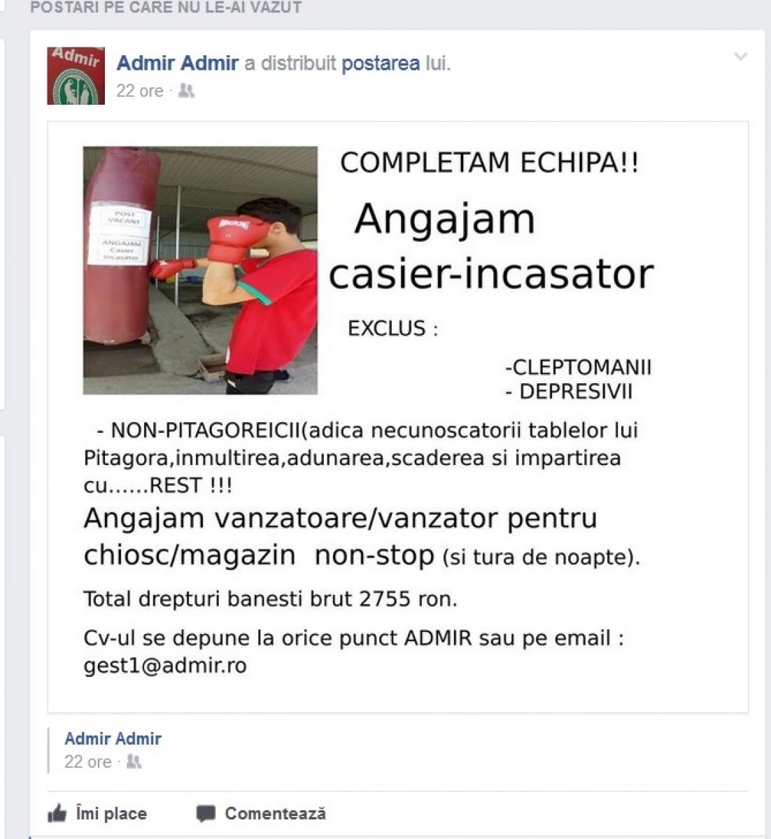 Administratorul de la Admir a anunțat că dorește un casier încasator în vederea unei bune colaborări însă…