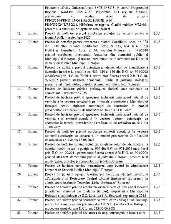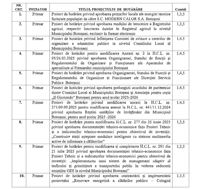 Se convocă, în şedinţă ordinară, Consiliul Local al Municipiului Botoşani, pentru data de 30.09.2025, ora 11:00, în sala de ședințe „Mihai Eminescu” din sediul Primăriei.