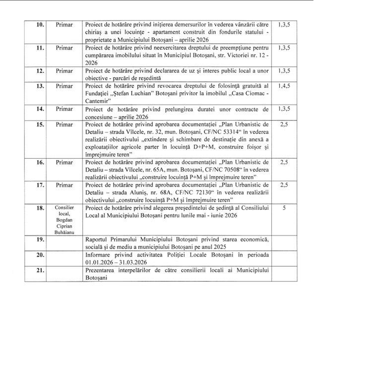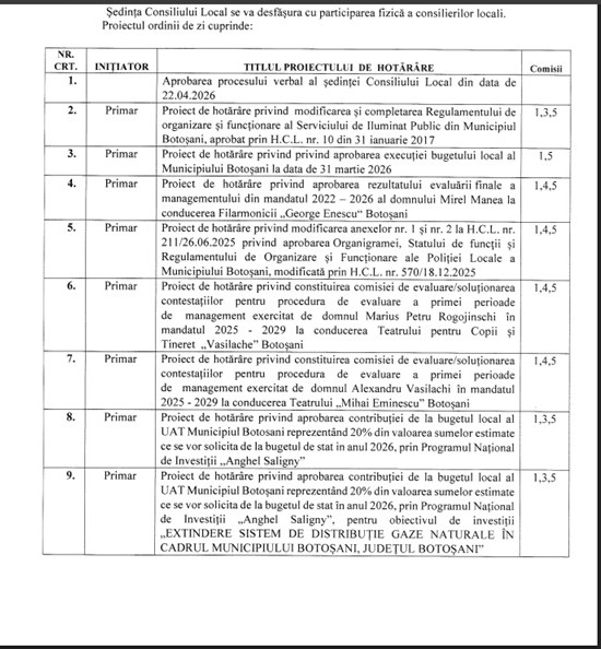 „Se convocă, în şedinţă ordinară, Consiliul Local al Municipiului Botoşani, pentru data de 30.04.2026, ora 11,00, în sala de ședințe „Mihai Eminescu” din sediul Primăriei.