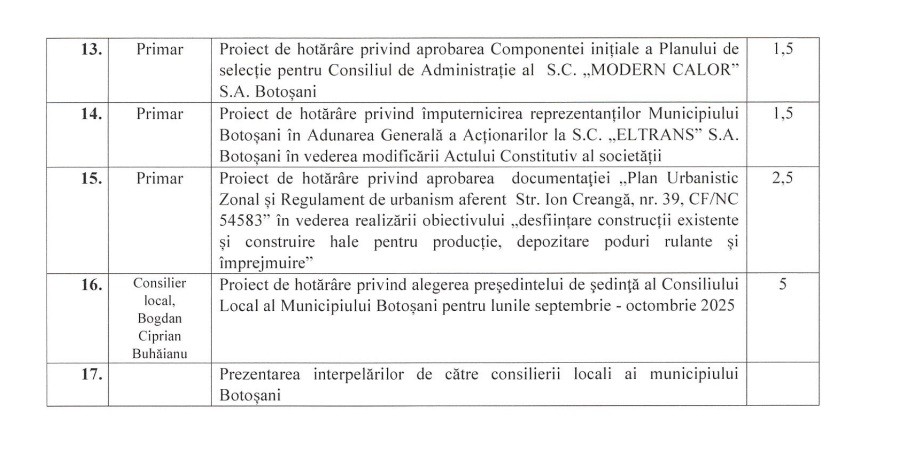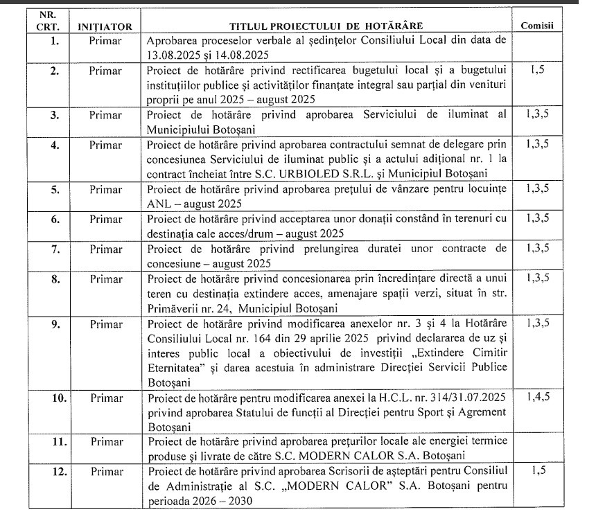 „Se convocă, în şedinţă ordinară, Consiliul Local al Municipiului Botoşani, pentru data de 28.08.2025, ora 11,00, în sala de şedințe ,,Mihai Eminescu" din sediul Primăriei.