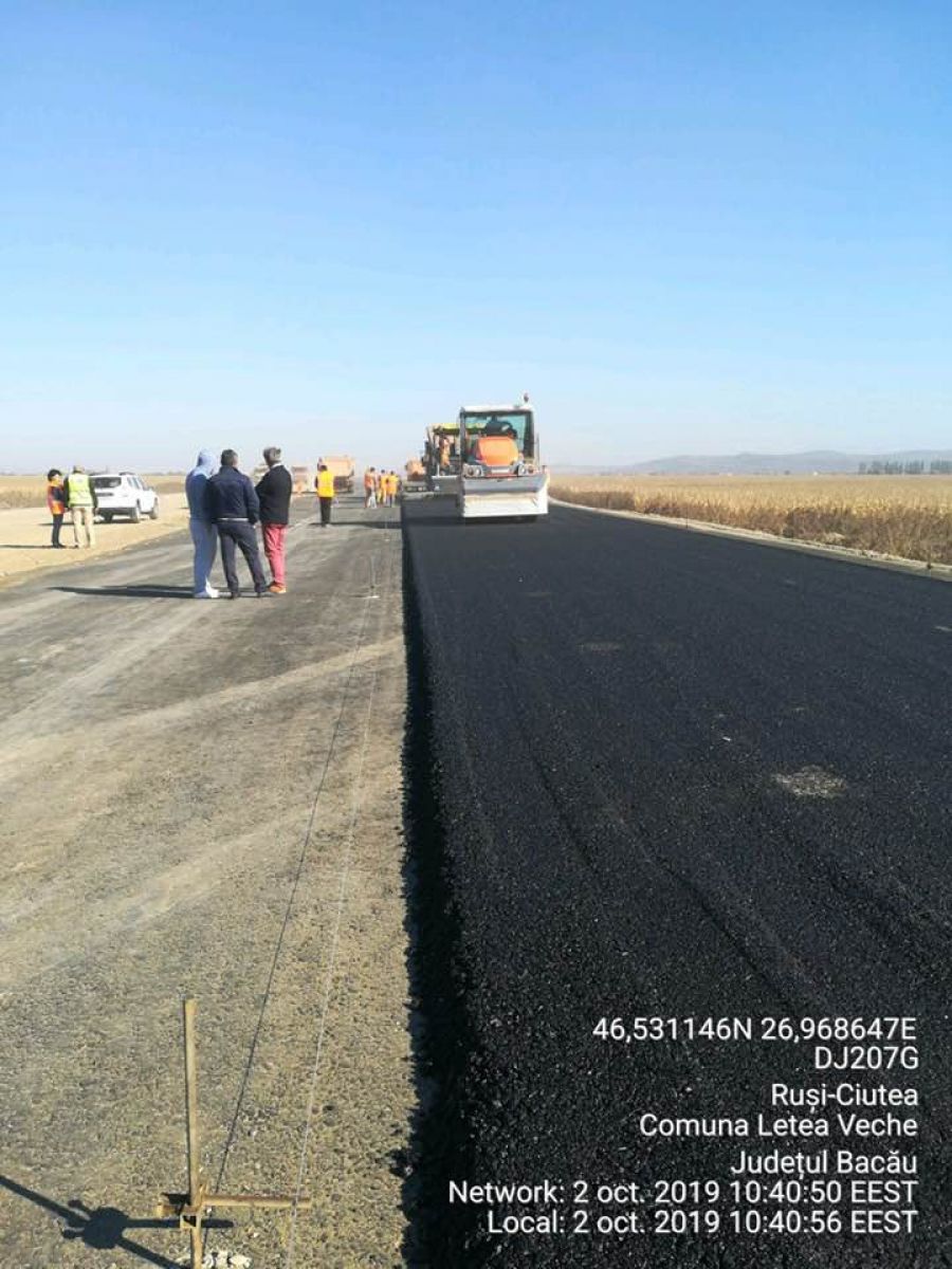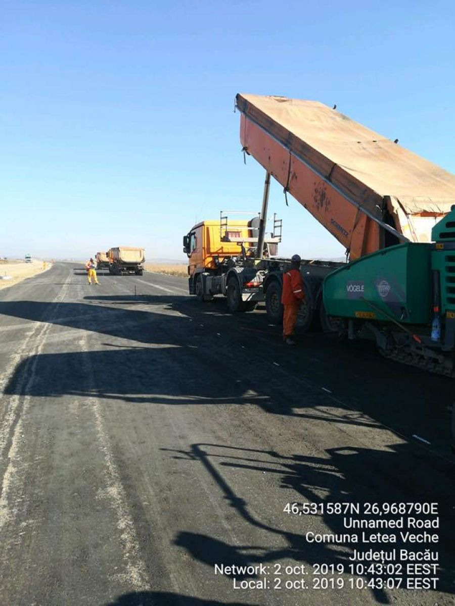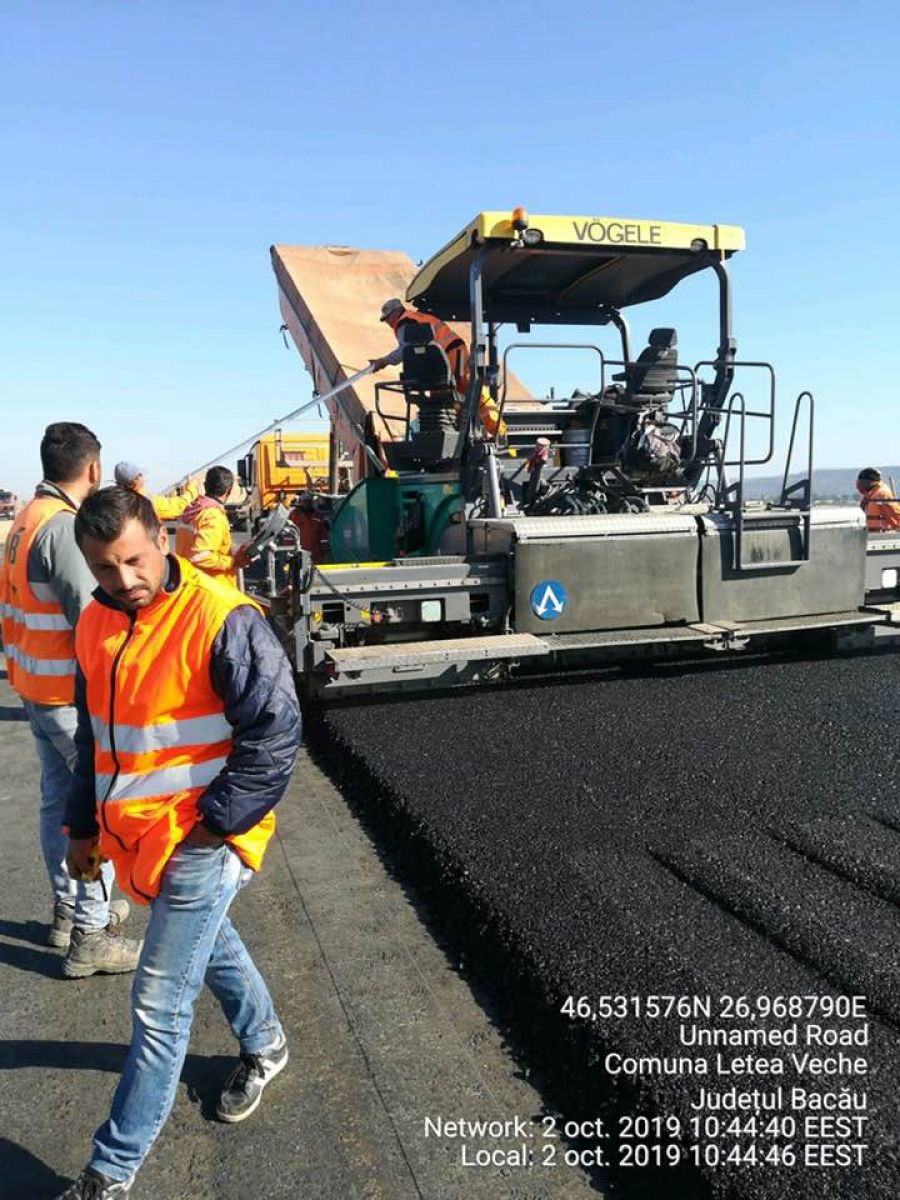 ”Constructorul desemnat (Asocierea Spedition UMB SRL – Tehnostrade SRL) a început astăzi, 02 octombrie 2019, lucrările de așternere a covorului asfaltic pe șantierul Variantei Ocolitoare a municipiului Bacău. Imaginile au fost surprinse la km 6+ 270 al șantierului, în zona localității Letea Veche, pe un sector experimental, unde astăzi s-a așternut mixtură asfaltică pe 4000 mp (1000 m lungime și 4 m lățime) . Mâine se va așterne mixtură pe o suprafață similară, urmând ca lucrările să continuie în perioada următoare pe întreg tronsonul de 16,2 km prevăzut în regim de autostradă (Obiectul 1), care face legătura între localitățile Nicolae Bălcescu și Stăuceni, pe DN2”, a scris pe Facebook Ovidiu Mugurel Laicu.