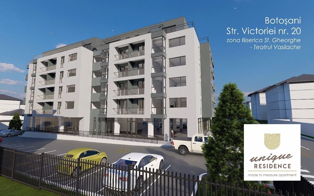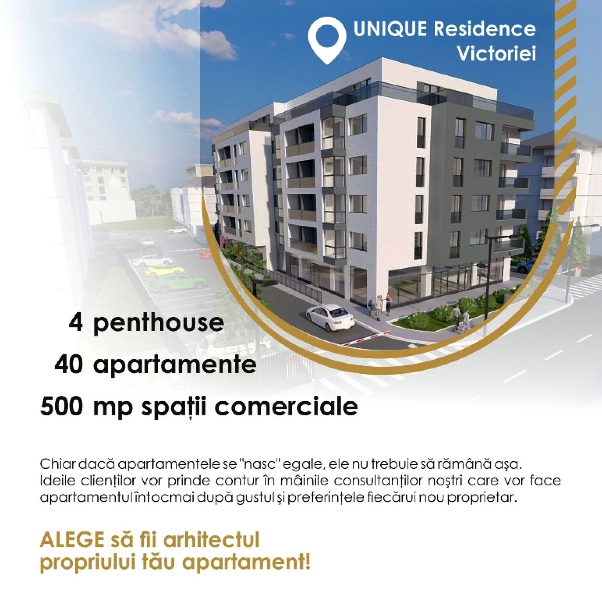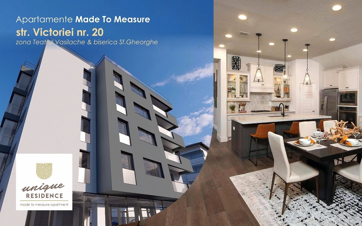 ”Vă propunem o nouă experiență prin care aveți posibilitatea de a fi arhitecții propriului apartament în noul ansamblu de apartamente Made To Measure UNIQUE Residence Victoriei: recompartimentări (în faza de proiectare), amenajări interioare și finisaje, echipare și mobilare, dotări de siguranță și confort SMART Home, sisteme de încălzire, ventilație și aer condiționat, aparataje electrice și corpuri de iluminat, precum și opțiuni pentru pachete cu dotări superioare personalizate și facilități extinse - similar ansamblului UNIQUE Residence Calea Națională.