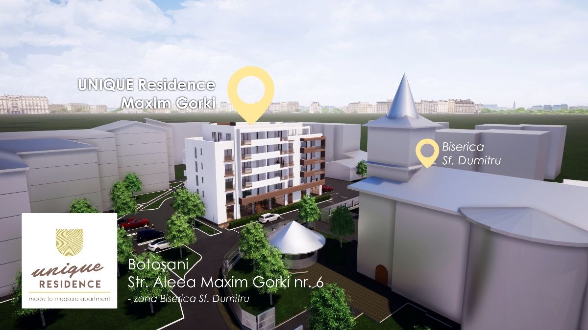 În contextul evoluției situaţiei epidemiologice actuale, în condițiile respectării stricte a măsurilor de combatere a noului coronavirus dispuse pe teritoriul României, asigurând protecția tuturor acelora cu care lucrăm, a partenerilor și colaboratorilor cu care interacționăm, a dumneavoastră, a noastră a tuturor, ne pregătim să demarăm lucrările de execuție la cel mai nou ansamblu de apartamente Made To Measure marca UNIQUE Residence, situat în centrul Botoșaniului, lângă Biserica Sf.Dumitru, pe str. Aleea Maxim Gorki nr.6.”
