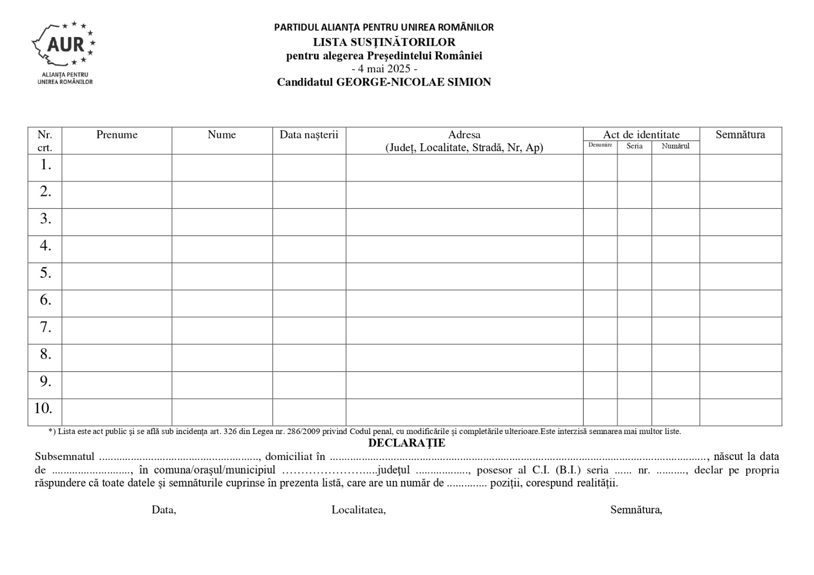 De asemenea, pentru cei care preferă să semneze din confortul de acasă, tabelul cu semnături poate fi descărcat online la: https://partidulaur.ro/tabel-semnaturi-george-simion/.