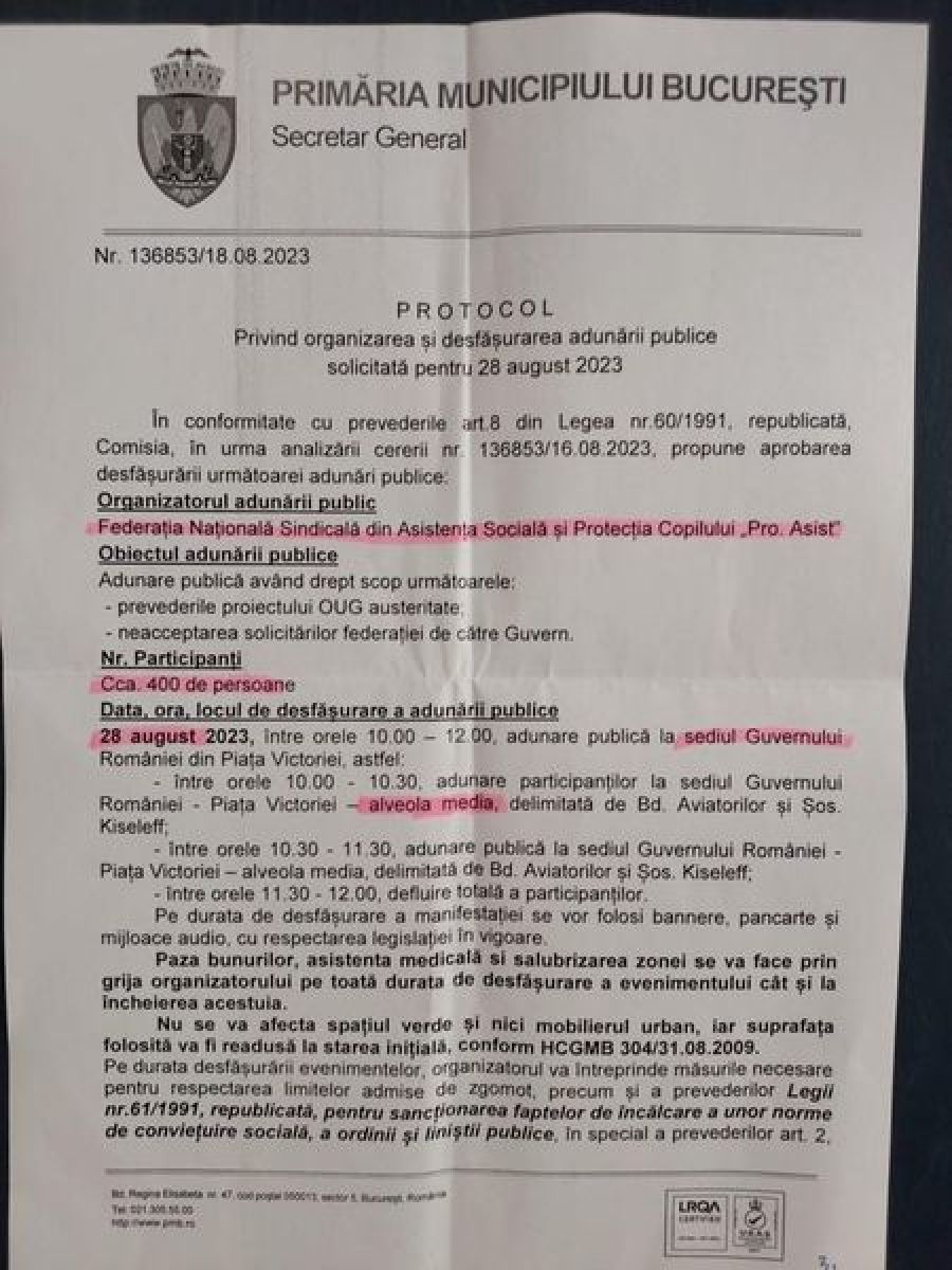 Aproximativ 500 de salariați din sectorul de activitate asistență socială și protecția copilului din întreaga țară vor protesta în data de 28 august 2023 în Piața Victoriei din București.