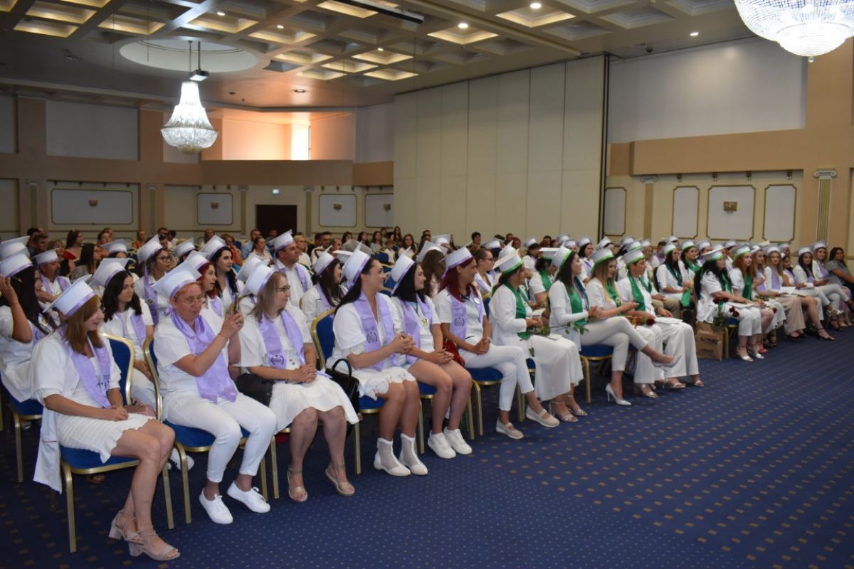 Absolvenții promoției 2023 s-au felicitat, îmbrățișat și fotografiat în robe albe, încheind festivitatea cu tradiționala fotografie de grup.