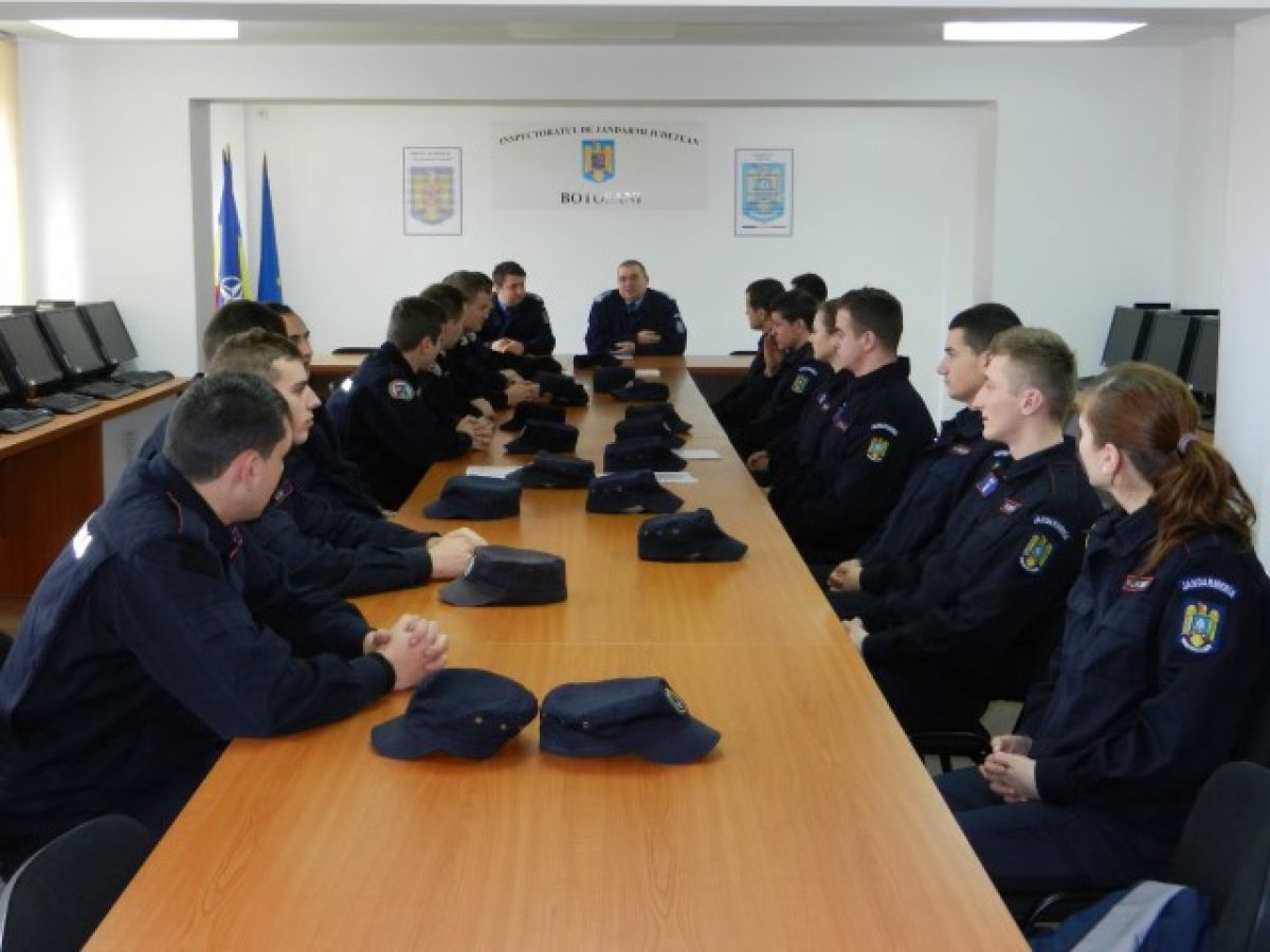 18 elevi jandarmi s-au familiarizat cu misiunile de pază şi protecţie instituţională executate de Inspectoratul de Jandarmi Judeţean Botoşani, la obiective precum Tribunalul Botoşani, Camera de Conturi, Trezoreria sau Instituţia Prefectului, unde au învăţat cum să acţioneze în diferite situaţii, conform procedurilor specifice de lucru. De asemenea, le-au fost prezentate exemple concrete cu care s-au confruntat jandarmii pe timpul executării serviciului şi modul în care s-a intervenit pentru aplanarea unor conflicte, precum şi măsurile legale luate potrivit competenţelor.