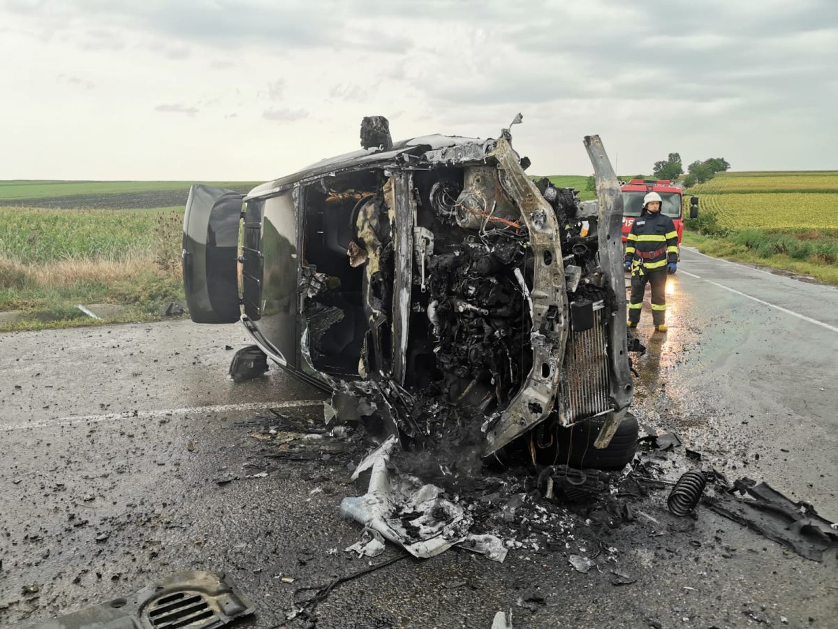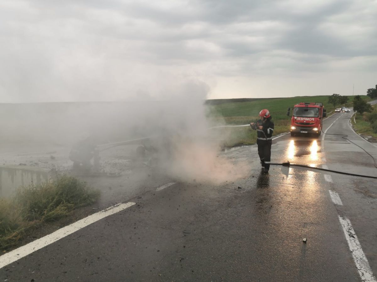 Doi tineri au fost în pericol după ce autoturismul în care se aflau s-a izbit într-un cap de pod, s-a răsturnat pe o parte și a luat foc.