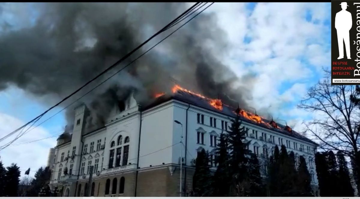 Pompierii botoșăneni intervin, alături de colegii din Suceava, pentru stingerea incendiului care a cuprins acoperișul clădirii Palatului Administrativ.