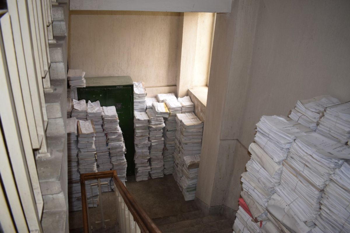 Una dintre intrările în această instituție publică este practic blocată de teancuri uriașe de dosare.