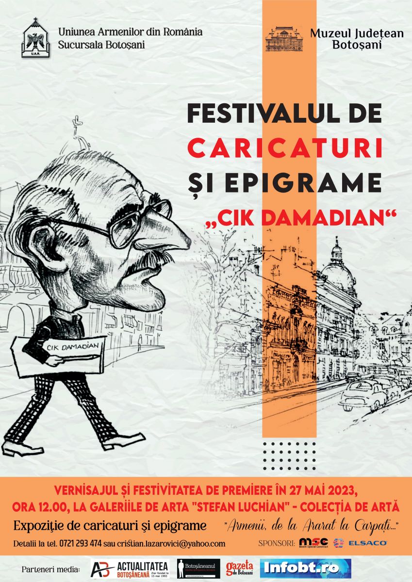 Muzeul Județean Botoșani găzduiește, în perioada 25 mai – 15 iunie 2023, în spațiul Colecției de Artă, ediția a III-a a Festivalului de Caricaturi și Epigrame „Cik Damadian”, eveniment organizat de Uniunea Armenilor din România, Sucursala Botoșani.
