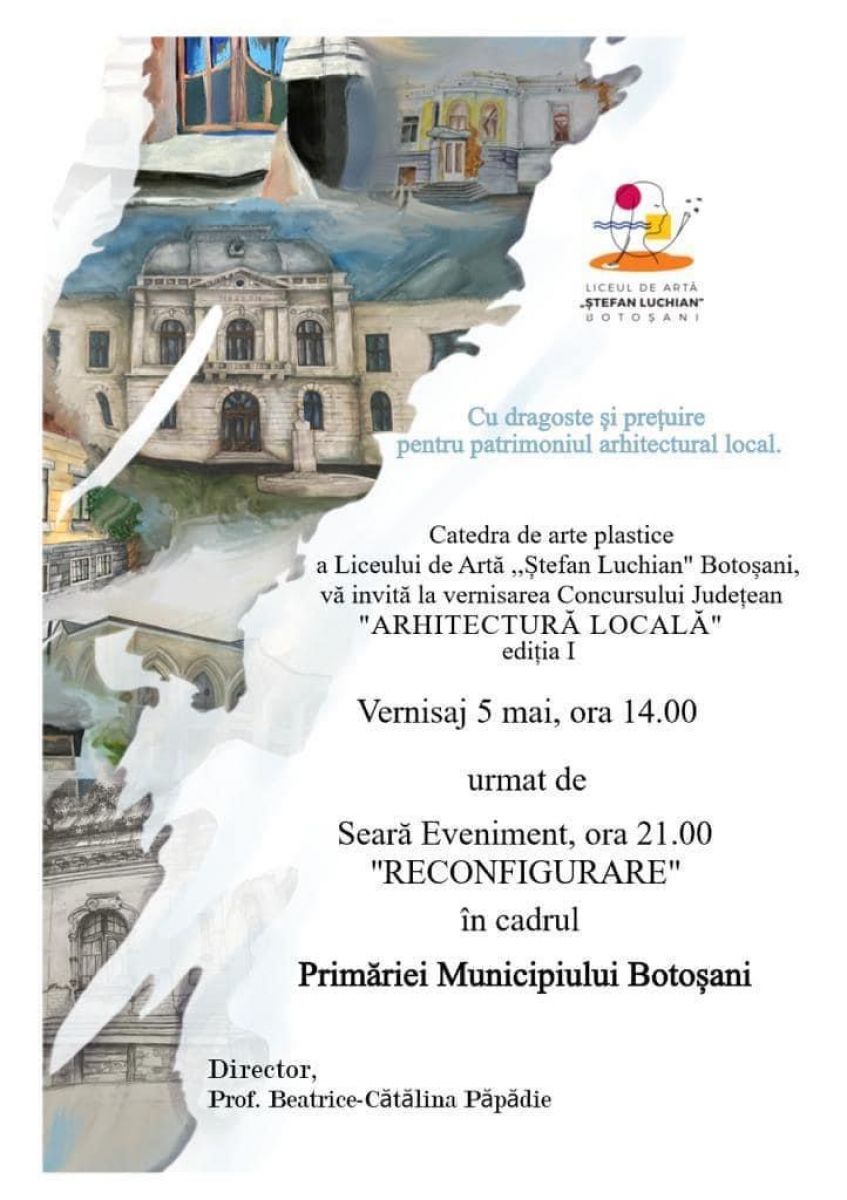 Vineri, 5 mai, la ora 14.00, în cadrul Primăriei Municipiului Botoșani, Liceul de Artă ”Ștefan Luchian” invită publicul la vernisajul expoziției stradale cu lucrările premiate la Concursul Județean de Arte Vizuale “Arhitectura locală” ediția I.