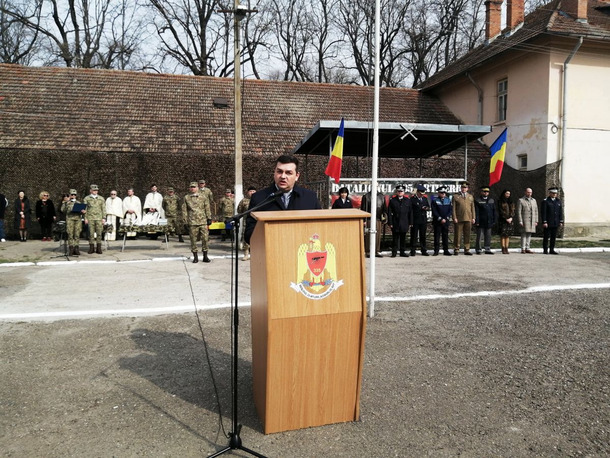 ”Mă simt onorat să particip astăzi, la acest eveniment din cadrul Batalionului 335 Artilerie Alexandru cel Bun. Ne înclinăm cu respect în fața celor care îmbracă haina militară, purtând în suflet dragostea și devotamentul față de Patrie. Se cuvine să ne aplecăm cu gratitudine și mândrie asupra fiecărui moment dedicat celor care slujesc sub drapelul tricolor pentru întreaga națiune. Am convingerea că dl comandant Obreja, susținut de experiența pe care o are, va duce la îndeplinire misiunile încredințate”.