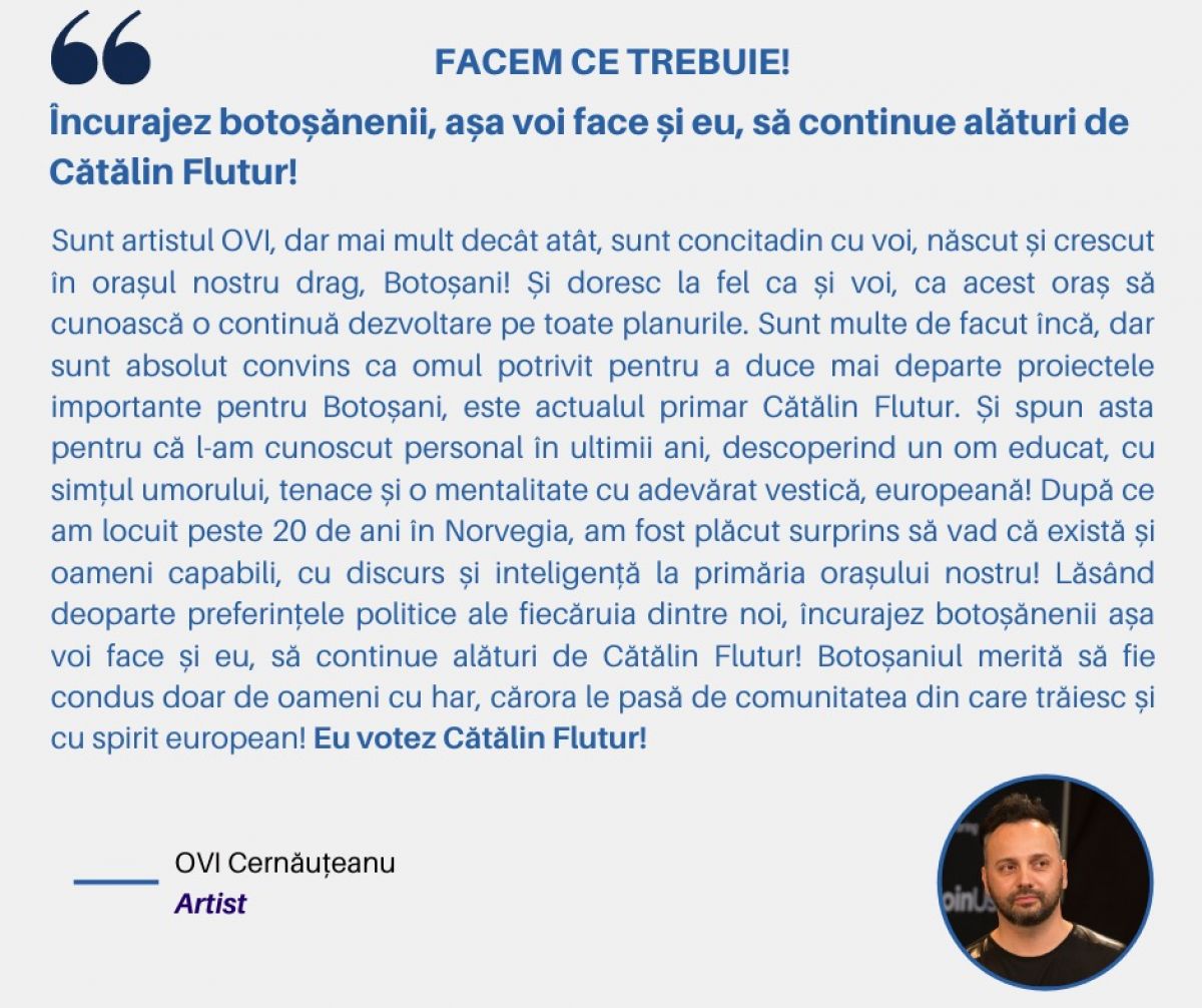 “Sunt artistul OVI, dar mai mult decât atât, sunt concitadin cu voi, născut și crescut în orașul nostru drag, Botoșani! Și doresc la fel ca și voi, ca acest oraș să cunoască o continuă dezvoltare pe toate planurile. Sunt multe de facut încă, dar sunt absolut convins ca omul potrivit pentru a duce mai departe proiectele importante pentru Botoșani, este actualul primar Cătălin Flutur. Și spun asta pentru că l-am cunoscut personal în ultimii ani, descoperind un om educat, cu simțul umorului, tenace și o mentalitate cu adevărat vestică, europeană! După ce am locuit peste 20 de ani în Norvegia, am fost plăcut surprins să vad că există și oameni capabili, cu discurs și inteligență la primăria orașului nostru! Lăsând deoparte preferințele politice ale fiecăruia dintre noi, încurajez botoșănenii așa voi face și eu, să continue alături de Cătălin Flutur! Botoșaniul merită să fie condus doar de oameni cu har, cărora le pasă de comunitatea din care trăiesc și cu spirit european! Eu votez Cătălin Flutur!”