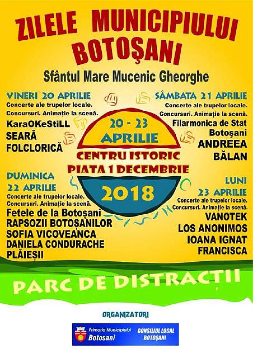 Programul dedicat Zilelor Municipiului Botoșani, eveniment desfășurat în intervalul 20 – 23 aprilie 2018: