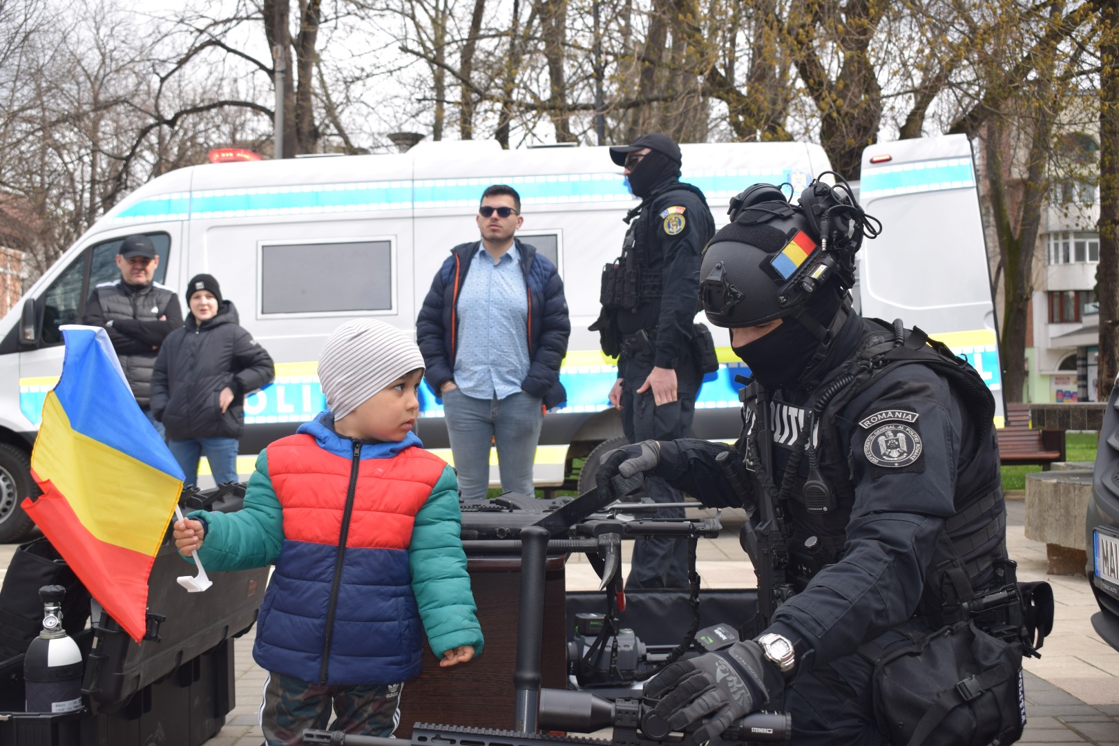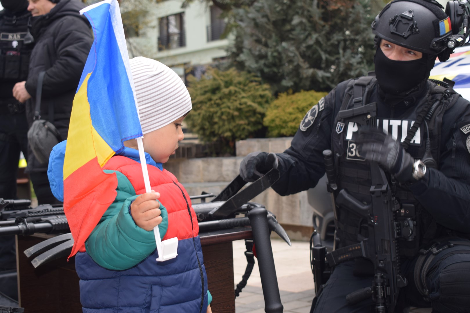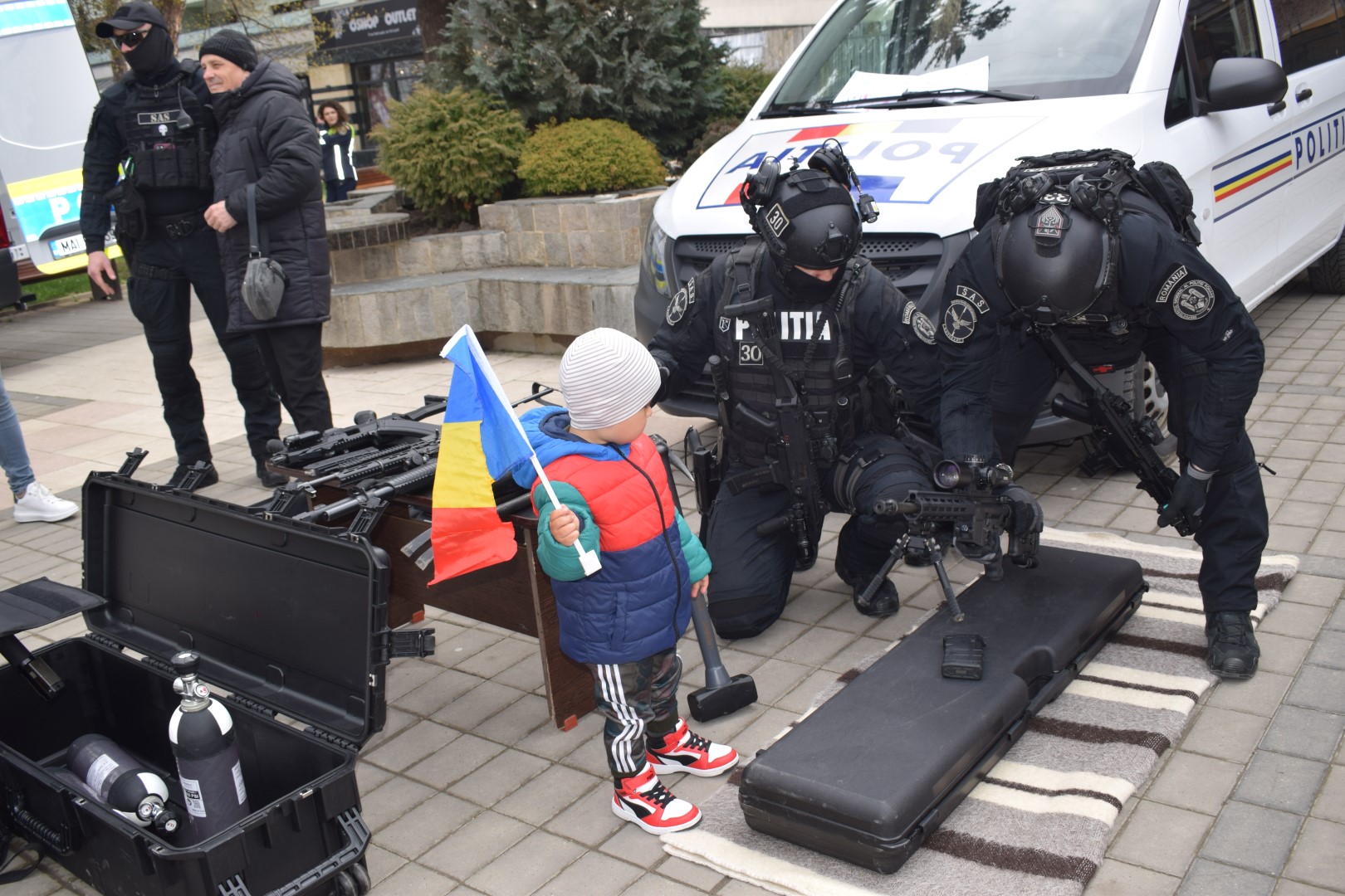 Aryan, băiețul găsit în pădure după 24 de ore de căutări, a fost alături de polițiști pe Pietonalul Unirii de ziua lor.