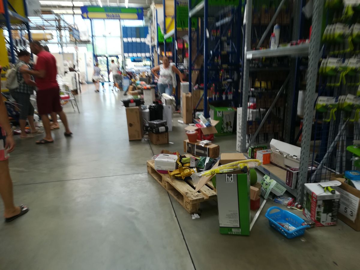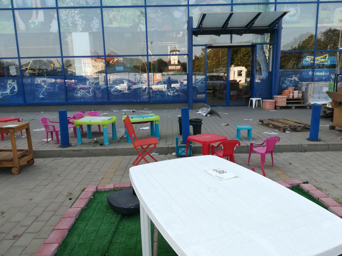 Iar aspectul de furtună care a măturat totul s-a propagat şi afară, acolo unde obiectele de grădinărit, mesele şi scaunele din plastic erau străjuite de resturi de la ambalaje.