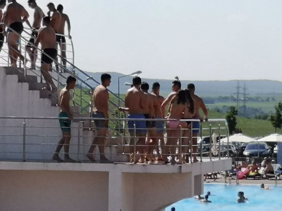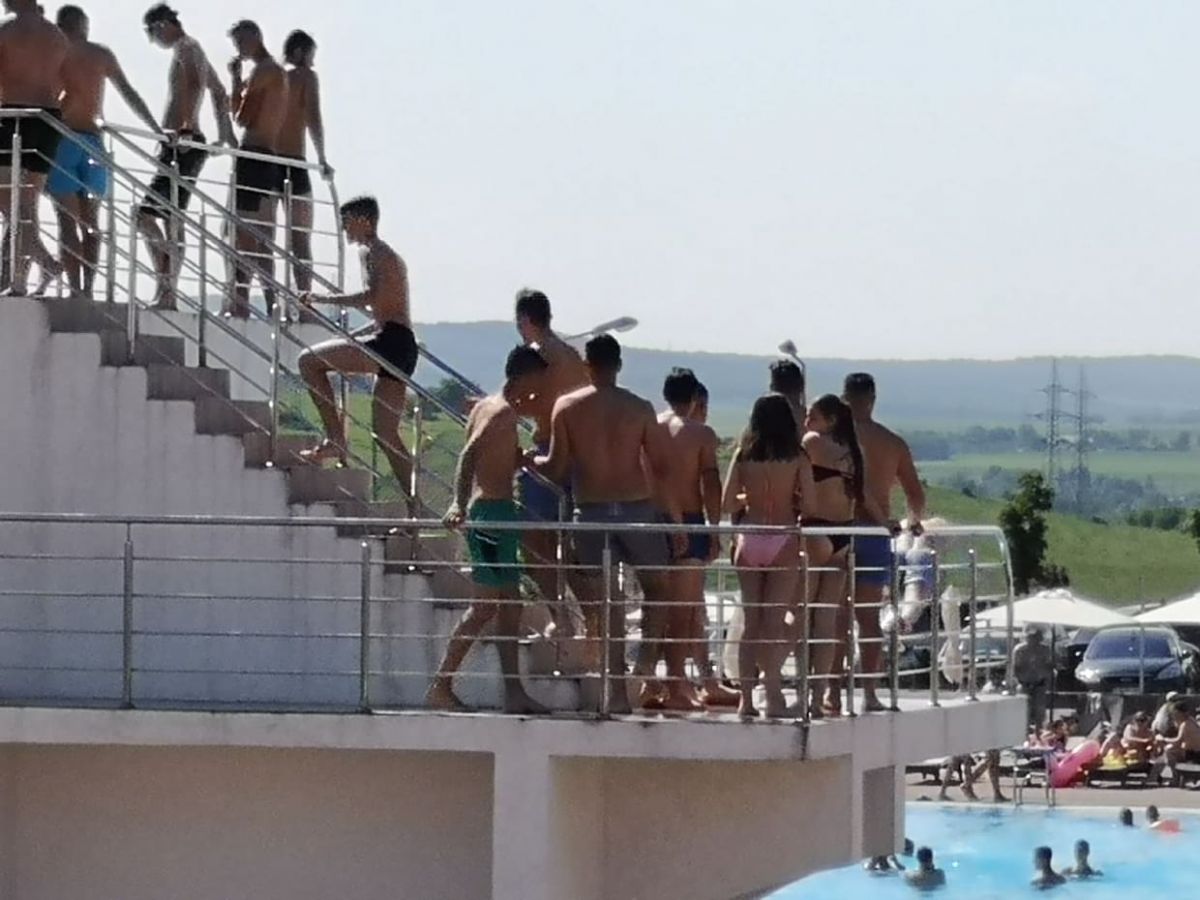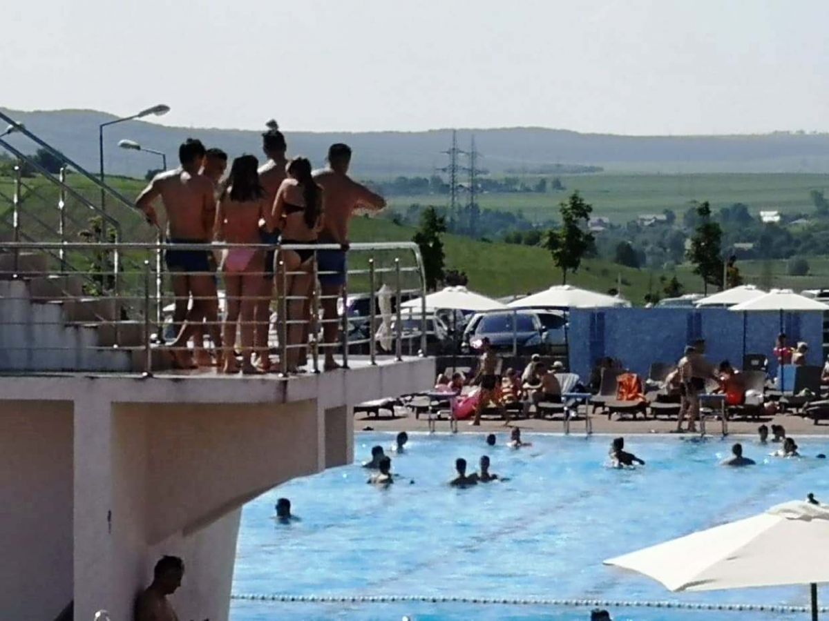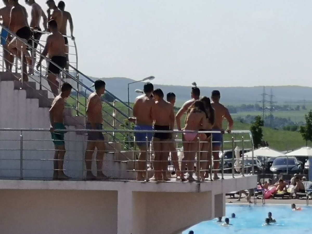Mai toate șezlongurile erau ocupate, iar la trambuline se stătea la coadă pentru săritul în apă.