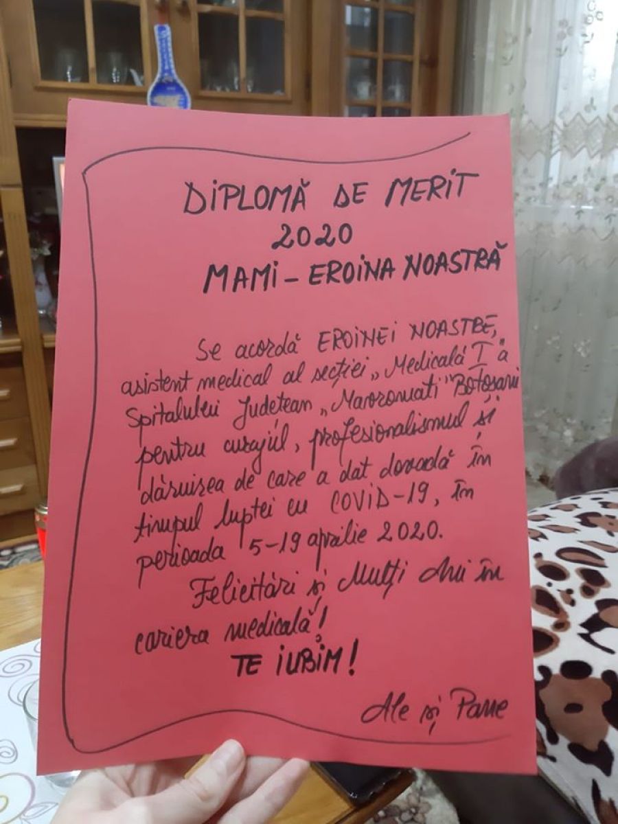 "Dana este eroul nostru! În calitate de asistent medical a îngrijit primii bolnavi infectați cu noul coronavirus SARS CoV 2, internați la Spitalul Judetean de Urgență Mavromati Botoșani. În tot acest timp, preventiv, a stat departe de familie. Timp de 27 de ani, de cand sunt militar, ea s-a rugat sa mă întorc sănătos la familia mea. De data aceasta eu sunt cel care a așteptat-o acasă, cu sufletul la gura"-