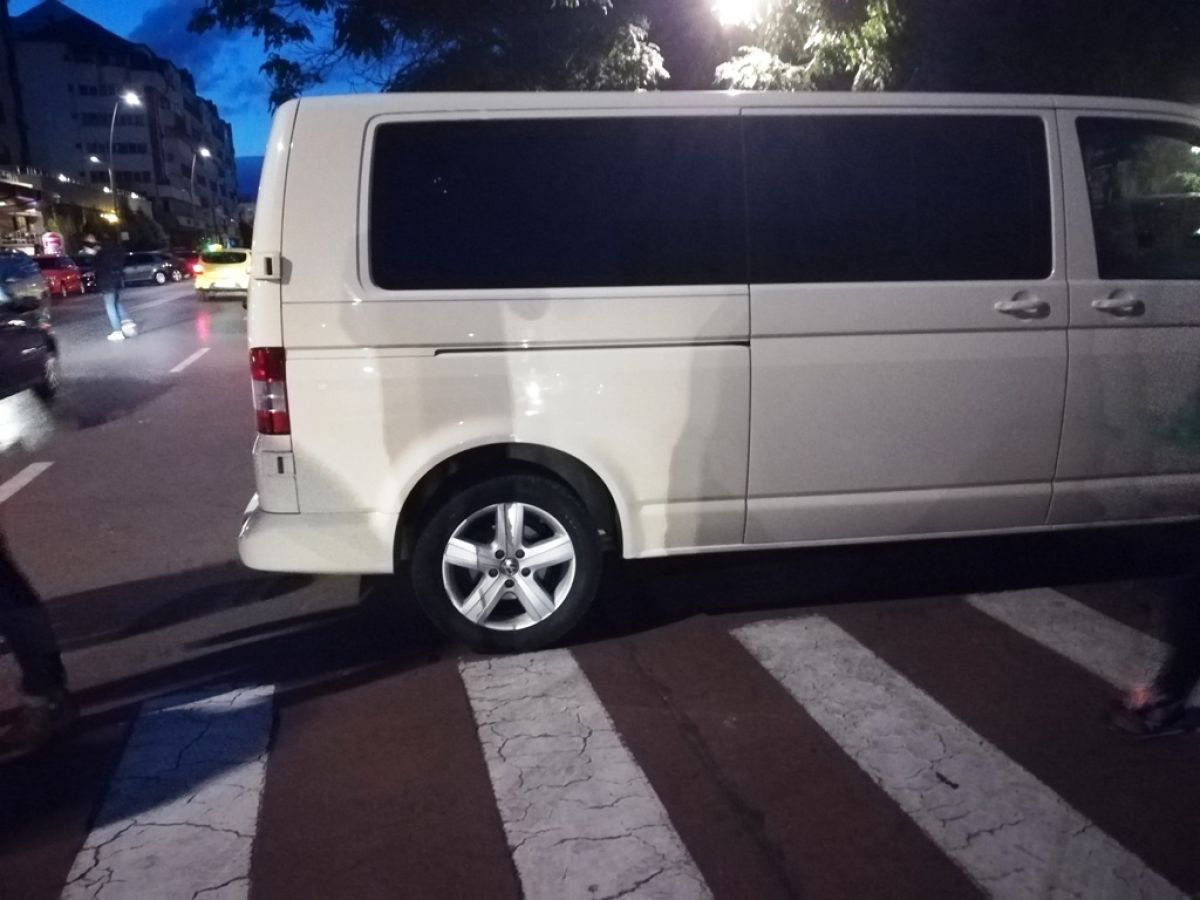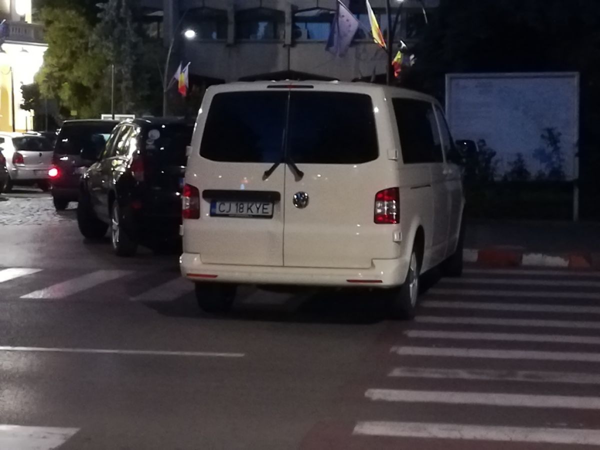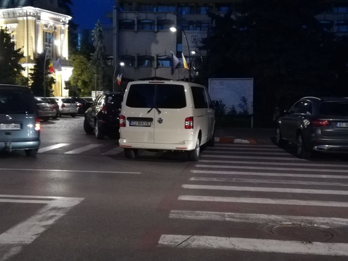 Este vorba de un Volkswagen Transporter care a fost parcat pe două treceri de pietoni: cea care traversează Piaţa Revoluţiei, de la parcul Rapsodia la Teatrul Mihai Eminescu şi cea de peste strada Cuza Vodă.