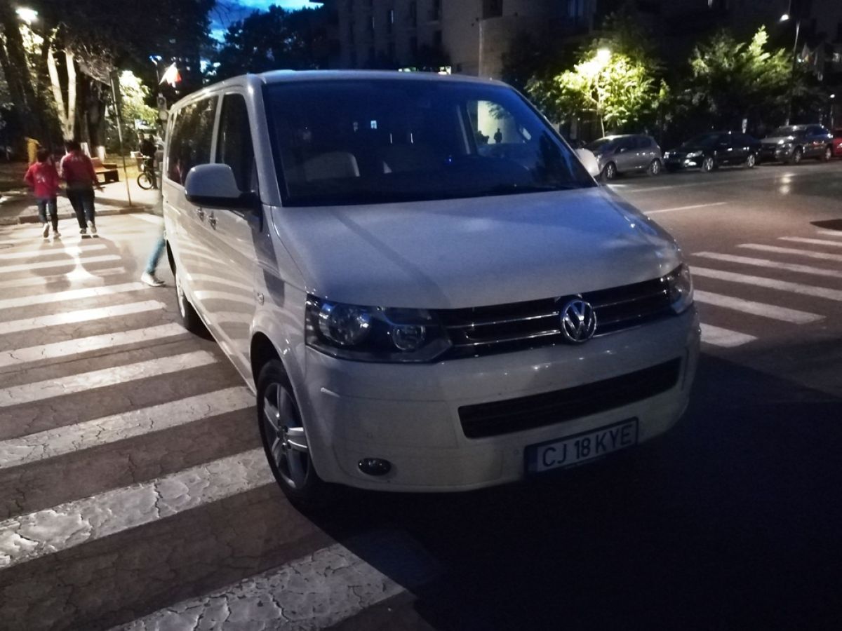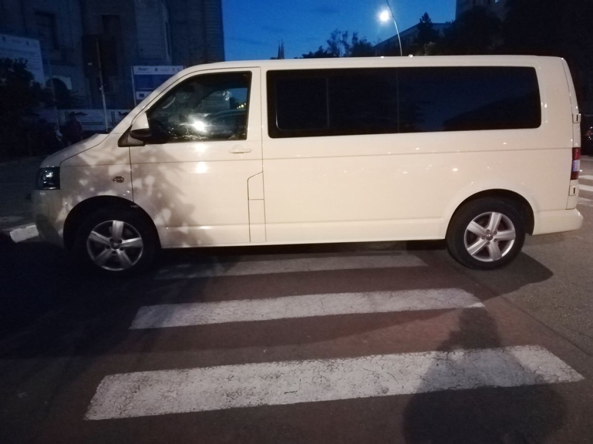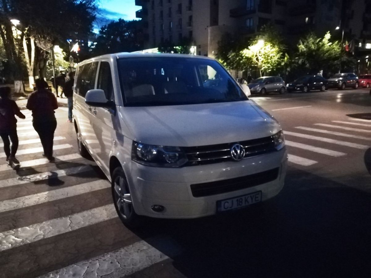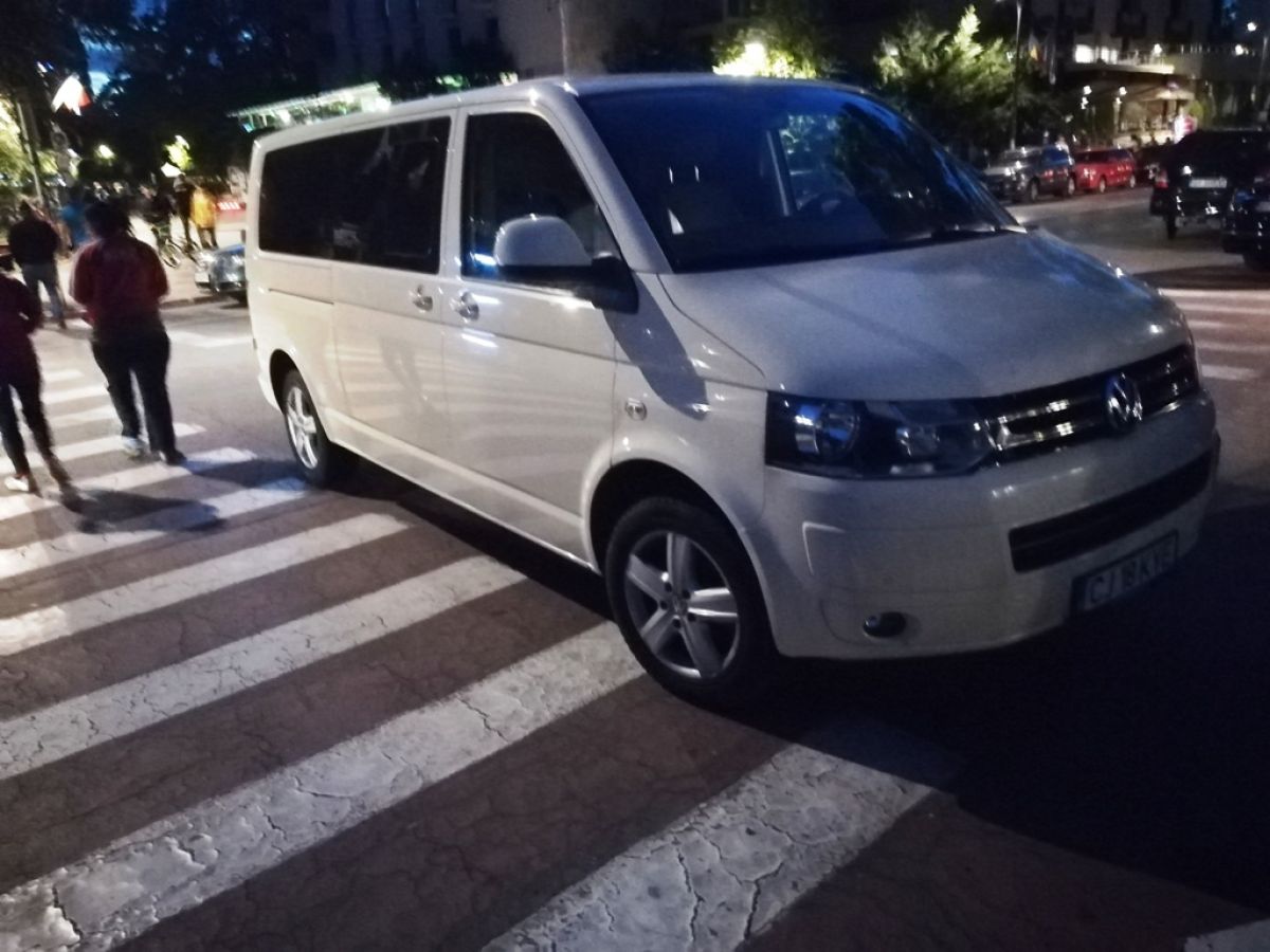Este vorba de un Volkswagen Transporter care a fost parcat pe două treceri de pietoni: cea care traversează Piaţa Revoluţiei, de la parcul Rapsodia la Teatrul Mihai Eminescu şi cea de peste strada Cuza Vodă.