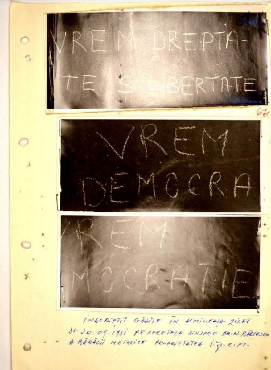 "La 16 ani, Mugur Călinescu (elev în clasa a X-a la liceul "A. T. Laurian"), influenţat de emisiunile de la Radio Europa Liberă, a pictat nopţi la rând zidurile clădirilor din oraş cu mesaje şi lozinci precum: "Cetăţeni! Trebuie să fim conştienţi de rolul nostru în societate şi să spunem un nu hotărât stărilor de lucruri ce se conturează la noi"; "În Polonia prietenă, oamenii au dobândit o libertate reală, au sindicate libere «Solidaritatea» şi «Solidaritatea rurală». Acestea le reprezintă cu adevărat drepturile chiar dacă au aceleaşi probleme alimentare ca şi noi"; "Vrem libertate"; "Vrem respectarea tuturor drepturilor"; "Nu mai putem accepta mizeriile şi nedreptăţile din ţara asta"; "Cetăţeni! Ţara noastră are o situaţie economică grea. Datoriile externe au atins 10 000 000 000 dolari, în timp ce în presă plouă cu "petale roz"; Vrem democraţie", scrie istoricul Mihail Bumbeş.
