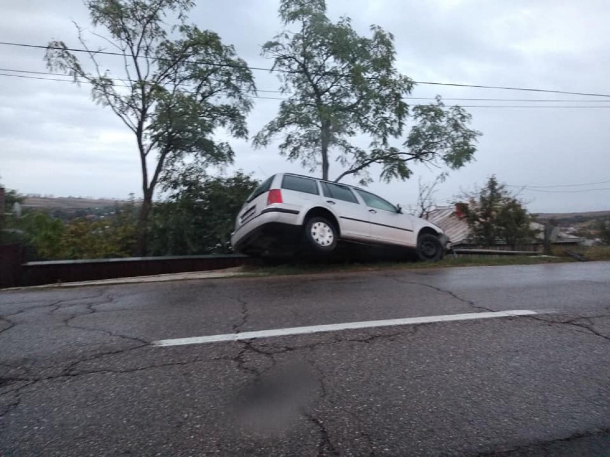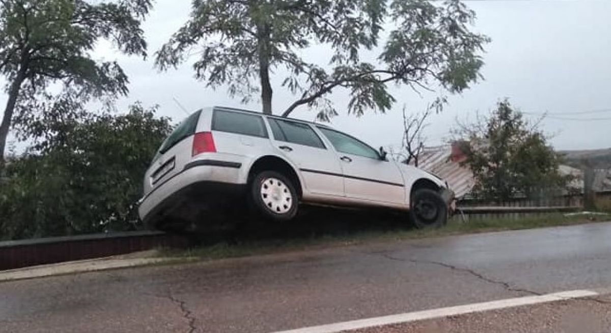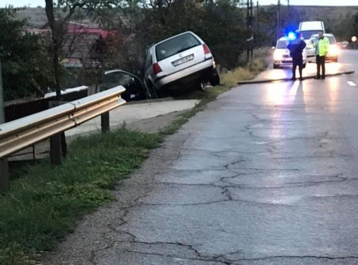 Un autoturism a ieșit de pe carosabil și a fost la un pas de a ajunge într-o curte. S-a oprit în parapetul metalic, mașina rămânând însă cu roțile din spate în aer. Din câte se pare, conducătorul auto, un bărbat în vârstă de 35 de ani, a pierdut controlul asupra volanului într-o curbă, cel mai probabil din cauza vitezei și a carosabilului umed.