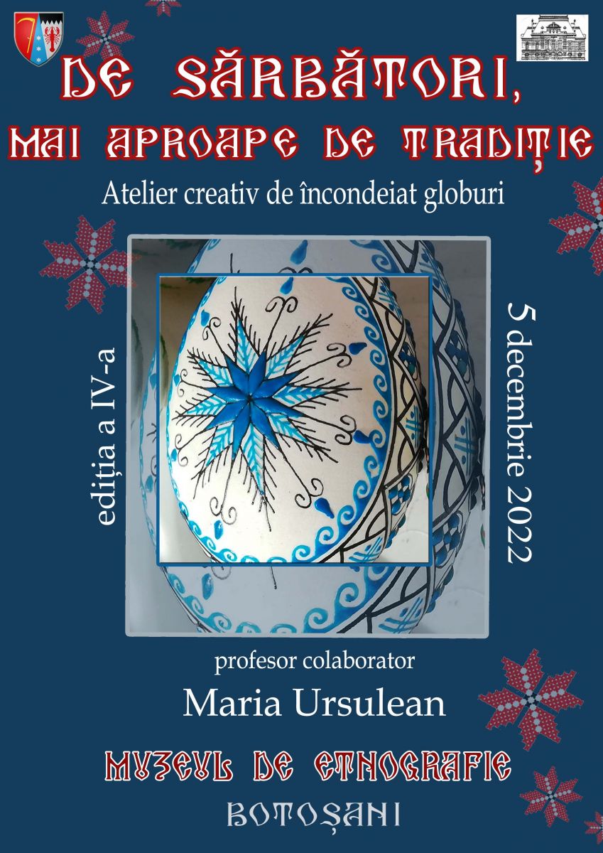 Muzeul Județean Botoșani, Secția de Artă plastică – Etnografie desfăşoară, în data de 5 decembrie 2022, începând cu ora 12.00, atelierele creative intitulate „De sărbători, mai aproape de tradiţie”, la sediul Muzeului de Etnografie din Bulevardul Mihai Eminescu, nr. 50.