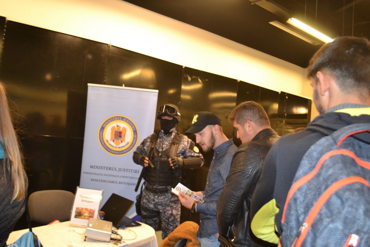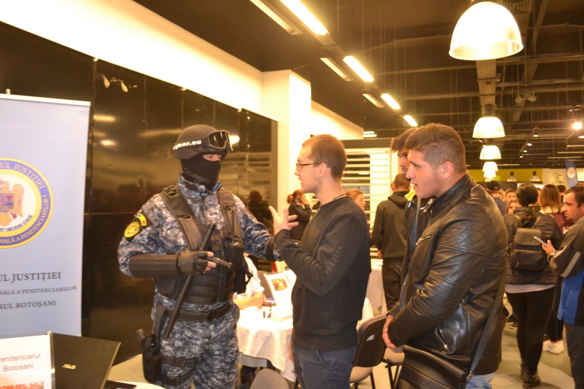 De asemenea, la standuri au prezentat oferte pentru admitere Inspectoratul pentru Situații de Urgențe (ISU) și Penitenciarul Botoșani. Motiv pentru care reprezentanții Penitenciarulului Botoșani au adus și un angajat de la Grupa de Intervenție. care practic a fost „vedeta” evenimentului.