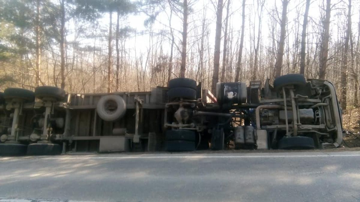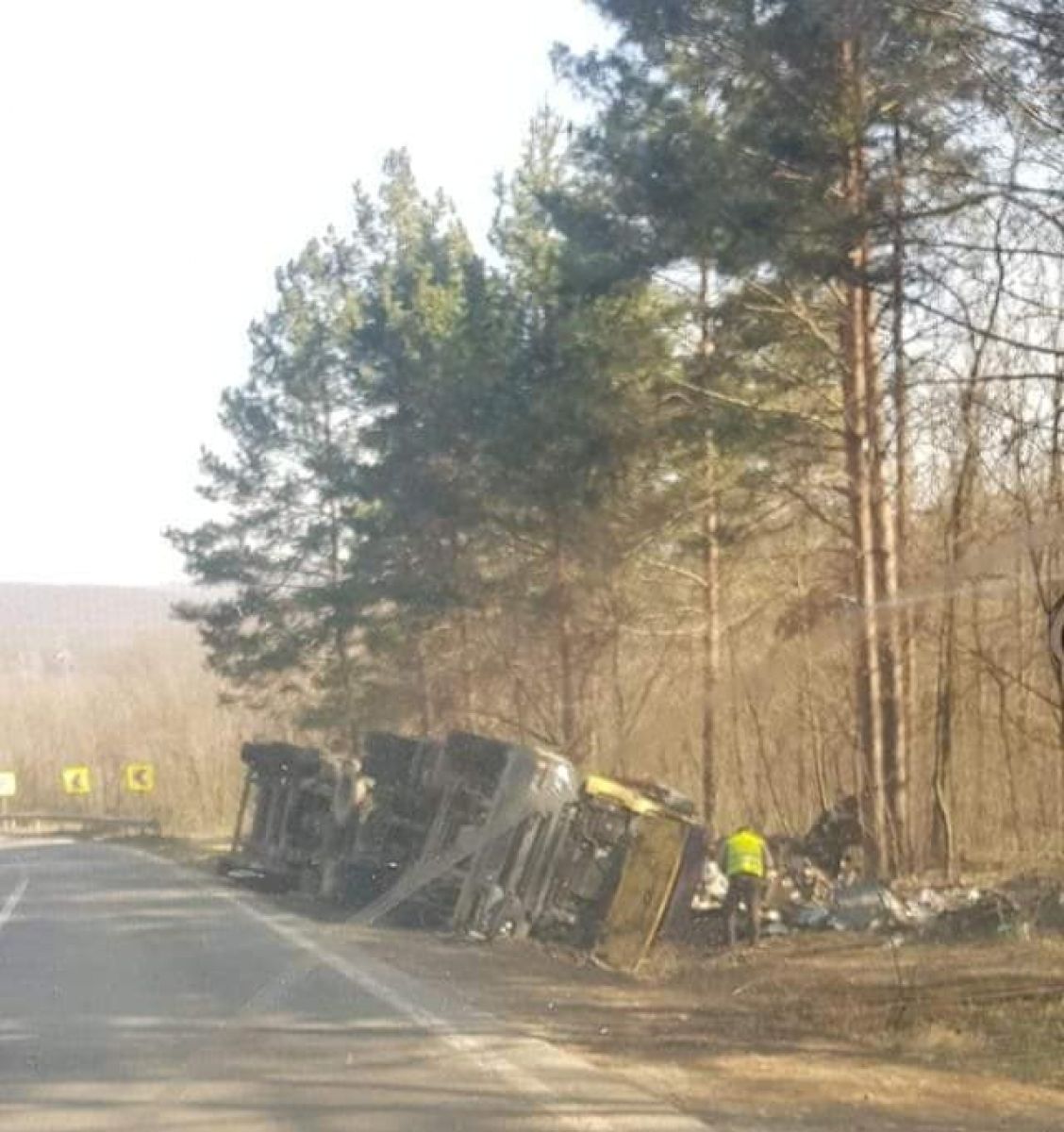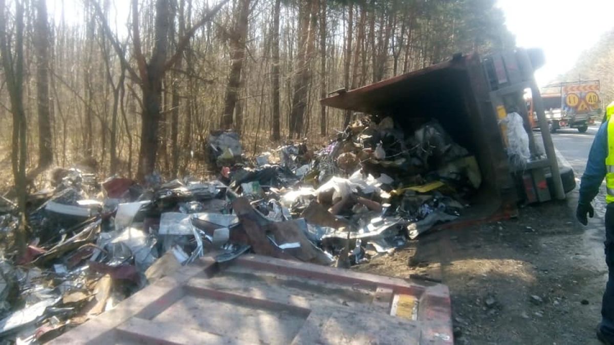 Un camion încărcat cu fier vechi, răsturnat din cauza balansului.