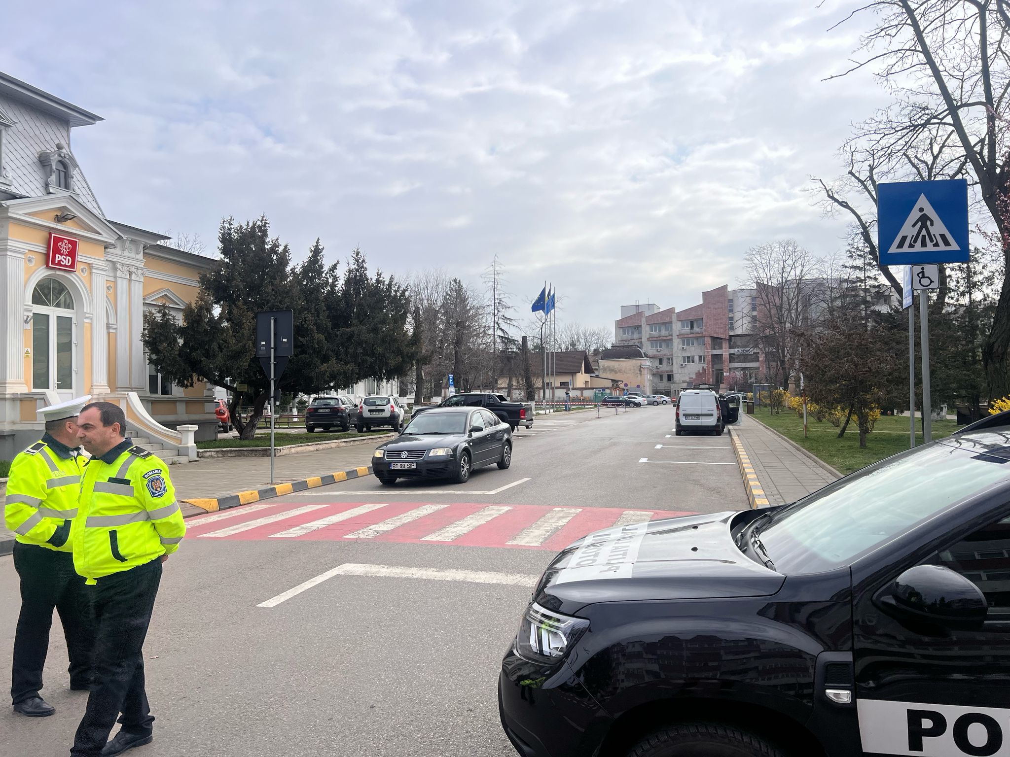 Un echipaj al Poliției Locale se află pe strada Cuza Vodă, în apropiere de sediul PSD pentru a împiedica accesul autoturismelor pe stradela din fața Centrului Militar.