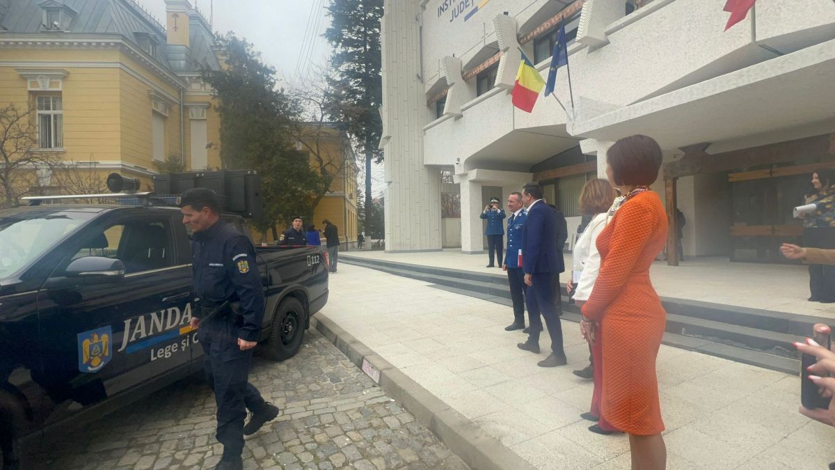A fost adusă în fața Palatului Administrativ, iar cei interesați, respectiv prefectul Sorin Cornilă și director de instituții publice au ieșit pentru a vedea exact de ce dotări dispune.