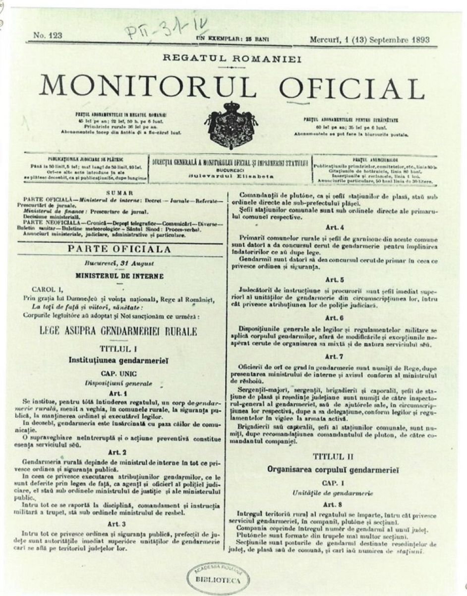 Legea Jandarmeriei Rurale a fost promulgată prin Decret Regal de regele Carol I.