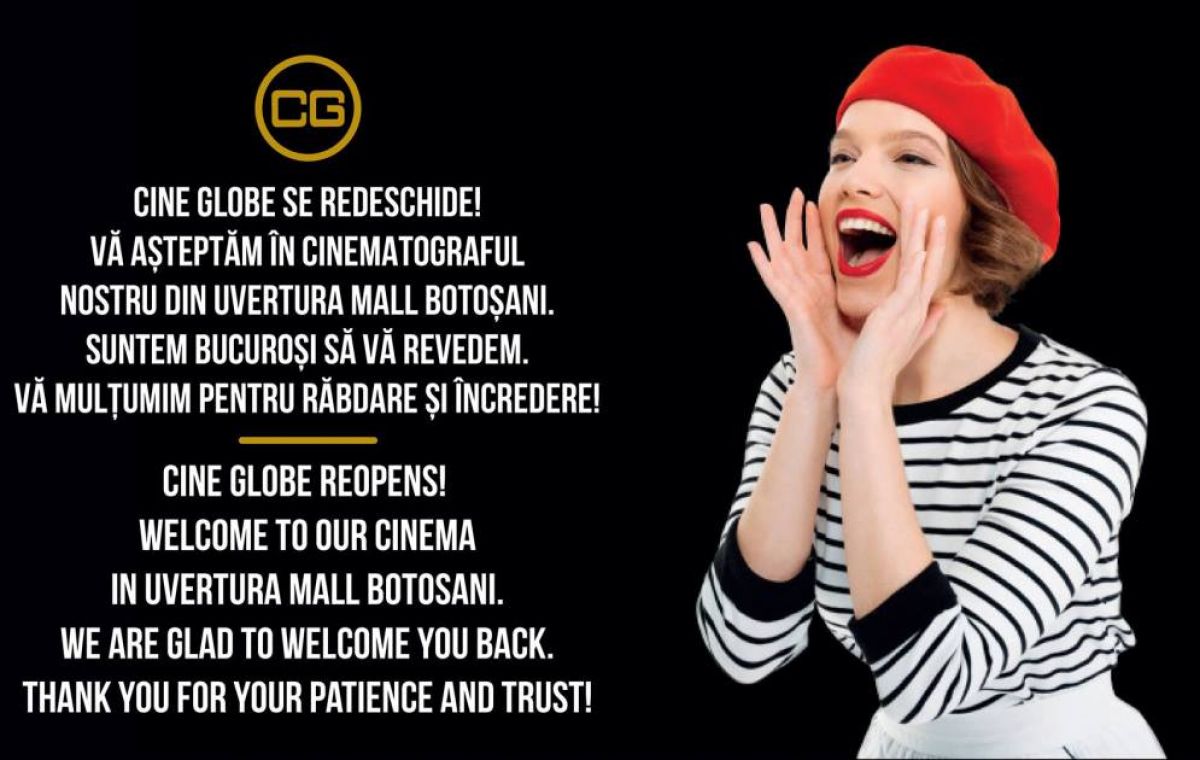 ”Cine Globe se redeschide. Vă așteptăm în cinematograful nostru din Uvertura Mall Botoșani. Suntem bucuroși să vă revedem. Vă mulțumim pentru răbdare și încredere”.