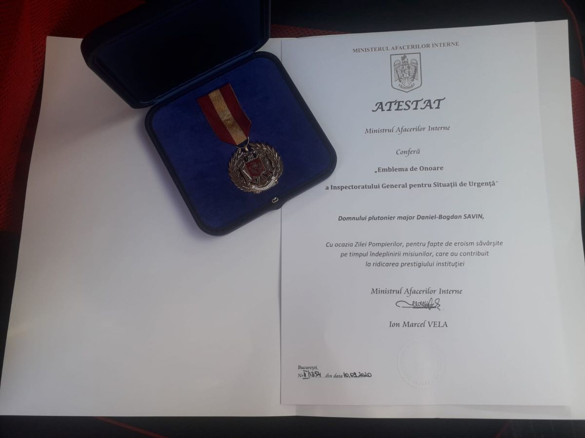 Luni, cu prilejul aniversării Zilei Pompierilor din România, colegul nostru, plutonier major Daniel Savin, din cadrul Detașamentului de Pompieri Dorohoi, a primit distincția "Emblema de onoare a I.G.S.U." din partea Ministrului Afacerilor Interne - Ioan Marcel Vela.