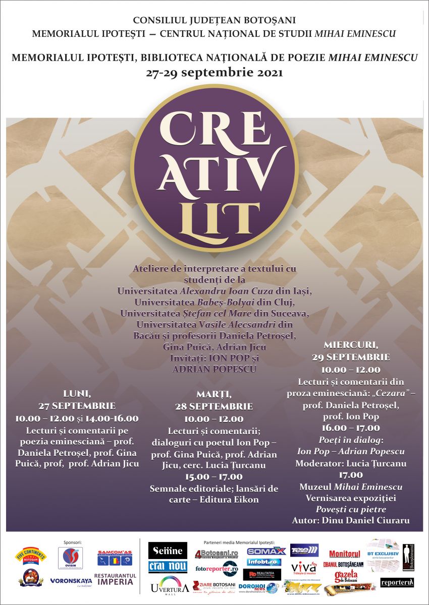 Memorialul Ipotești – Centrul Național de Studii Mihai Eminescu organizează, în perioada 27-30 septembrie 2021, a treia ediție a Atelierelor de interpretare a textului CreativLit.