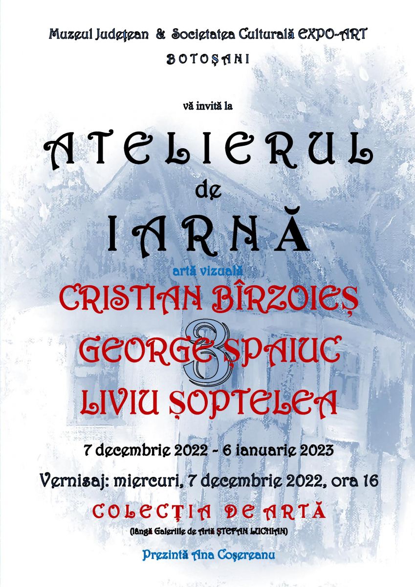 Muzeul Județean Botoșani și Societatea Culturală Expo-Art Botoșani vă invită, în perioada 7 decembrie 2022 – 6 ianuarie 2023, la Colecția de Artă a Secției de Artă Plastică și Etnografie (lângă Galeriile de Artă „Ștefan Luchian”) pentru a vizita „Atelierul de iarnă”, ediția a III-a.