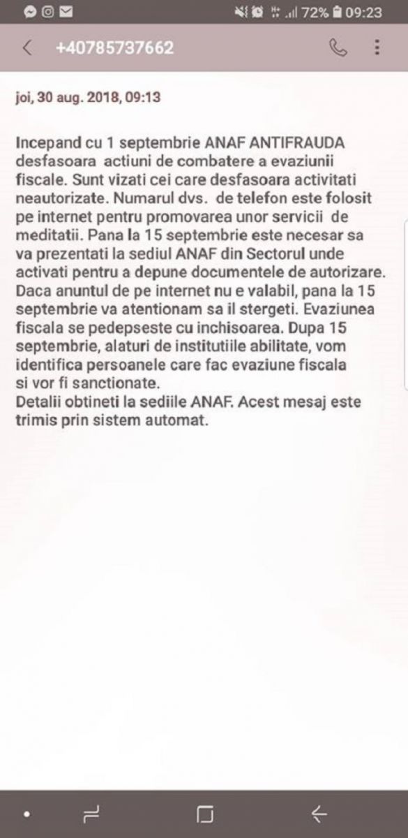 Vezi mai jos mesajul trimis în numele ANAF-ului